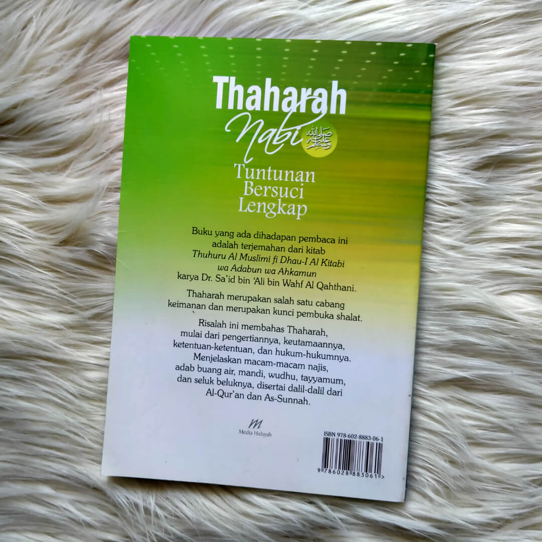 "Buku Thaharah Nabi Tuntunan Bersuci Lengkap yang ada di hadapan Anda ini adalah terjemahan dari kitab Thuhuru Al Muslimi fi Dhau-i Al Kitabi wa As Sunnati Mafhumun wa Fadhailu wa Adabun wa Ahkamun karya Dr. Said bin Ali bin Wahb Al Qahthani. Buku yang bermanfaat ini membahas fiqih thaharah mulai dari pengertiannya, jenis-jenisnya, macam-macam najis, adab-adab buang air, dan seluk-beluk thaharah yang lain. Fiqih thaharah ini disampaikan secara ilmiah berdasarkan dalil dari Al-Qur’an dan Hadits Nabi Shalallahu ‘alaihi wa Sallam sehingga sangat layak digunakan buku bacaan referensi thaharah dan berwudhu.