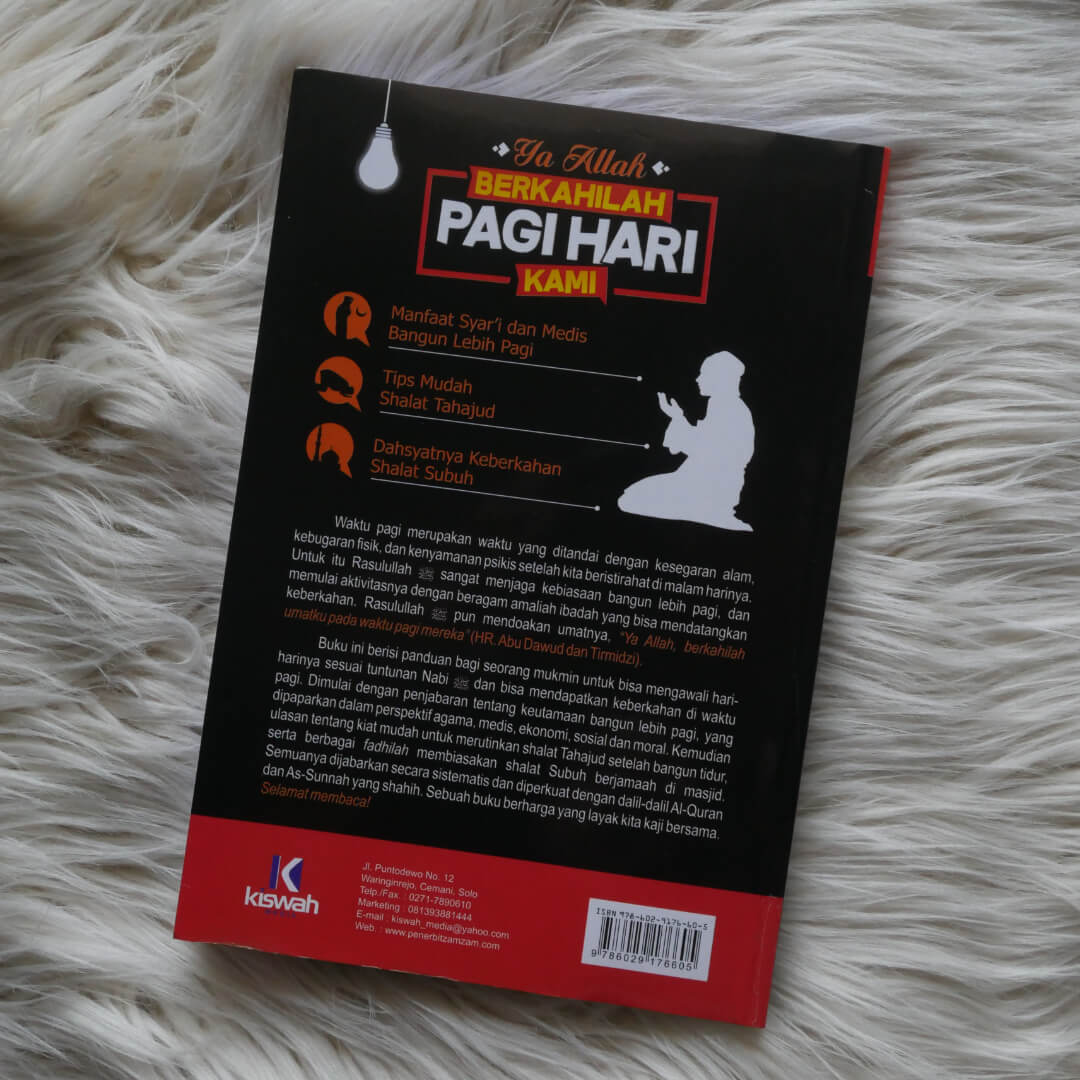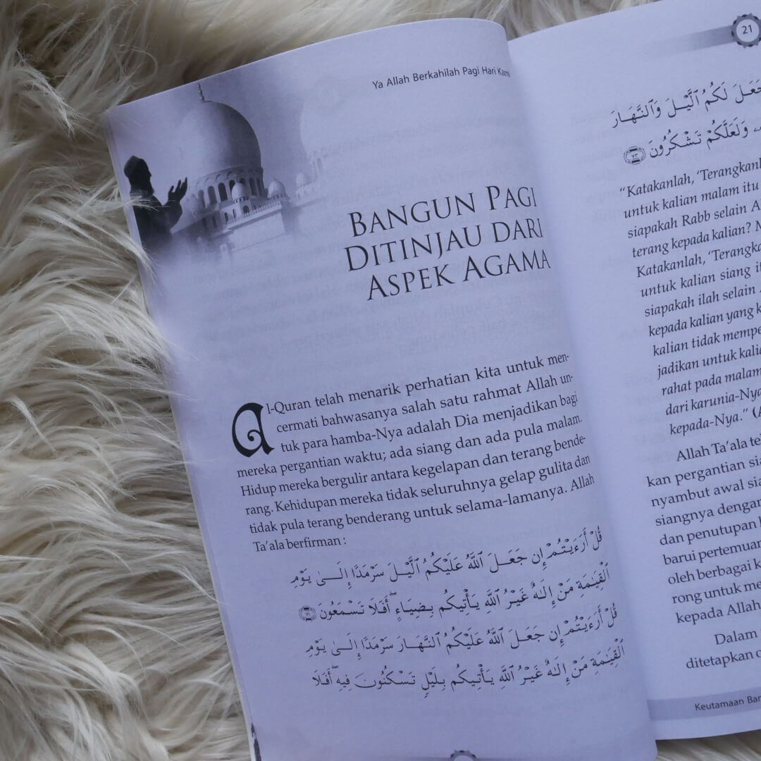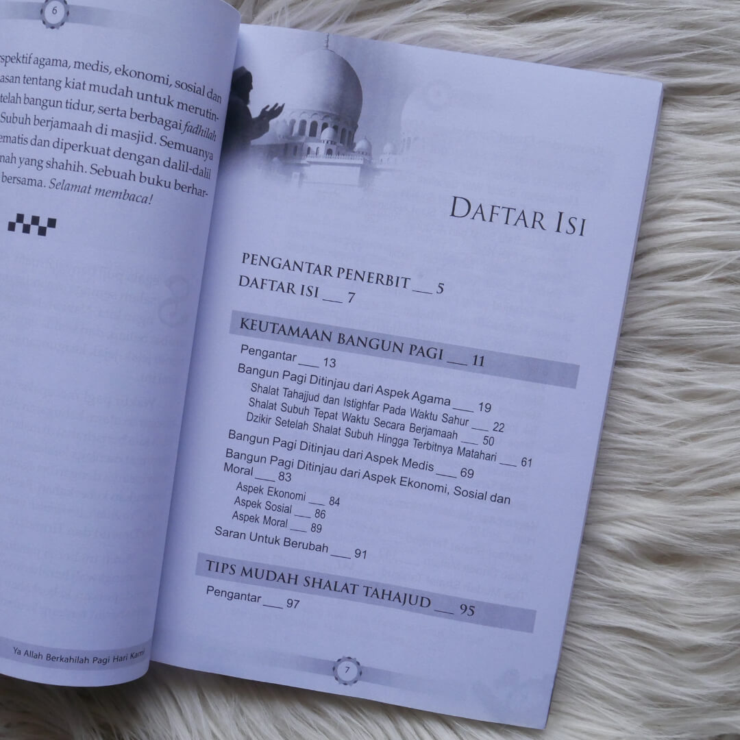 Buku Ya Allah Berkahilah Pagi Hari Kami ini juga berisi panduan bagi seorang mukmin untuk bisa mengawali hari-harinya sesuai tuntunan Nabi shalallahu ‘alaihi wa sallam dan bisa mendapatkan keberkahan di waktu pagi. Dimulai dengan penjabaran tentang keutamaan bangun lebih pagi, yang dipaparkan dalam perspektif agama, medis, ekonomi, sosial dan moral. Kemudian ulasan tentang kiat mudah untuk merutinkan shalat Tahajud setelah bangun tidur, serta berbagai fadhilah membiasakan shalat Subuh berjamaah di masjid. Semuanya dijabarkan secara sistematis dan diperkuat dengan dalil-dalil Al-Quran dan As-Sunnah yang shahih. Sebuah buku berharga yang layak kita kaji bersama. Selamat membaca!