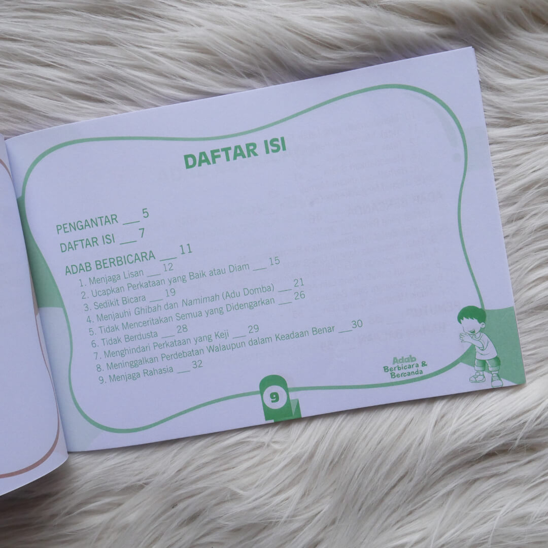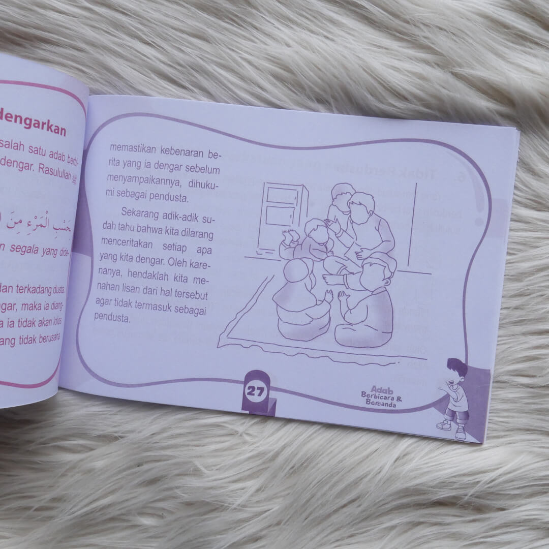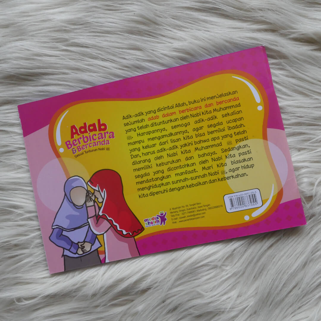 "Buku Adab Berbicara dan Bercanda Sesuai Tuntunan Nabi ini menjelaskan sejumlah adab dalam berbicara dan bercanda sesuai dengan yang telah dituntunkan Rasulullah Muhammad Shallallahu ‘Alaihi Wasallam. Disajikan dengan bahasa sederhana dan mudah dimengerti serta dilengkapi dengan gambar-gambar berwarna yang menarik, membuat adik-adik tidak akan bosan dalam membaca dan belajar. Buku yang cocok digunakan sebagai referensi pokok dalam pembahasan pendidikan anak muslim.