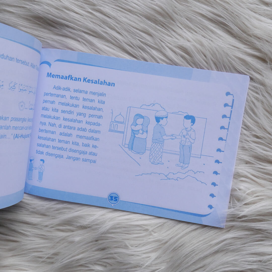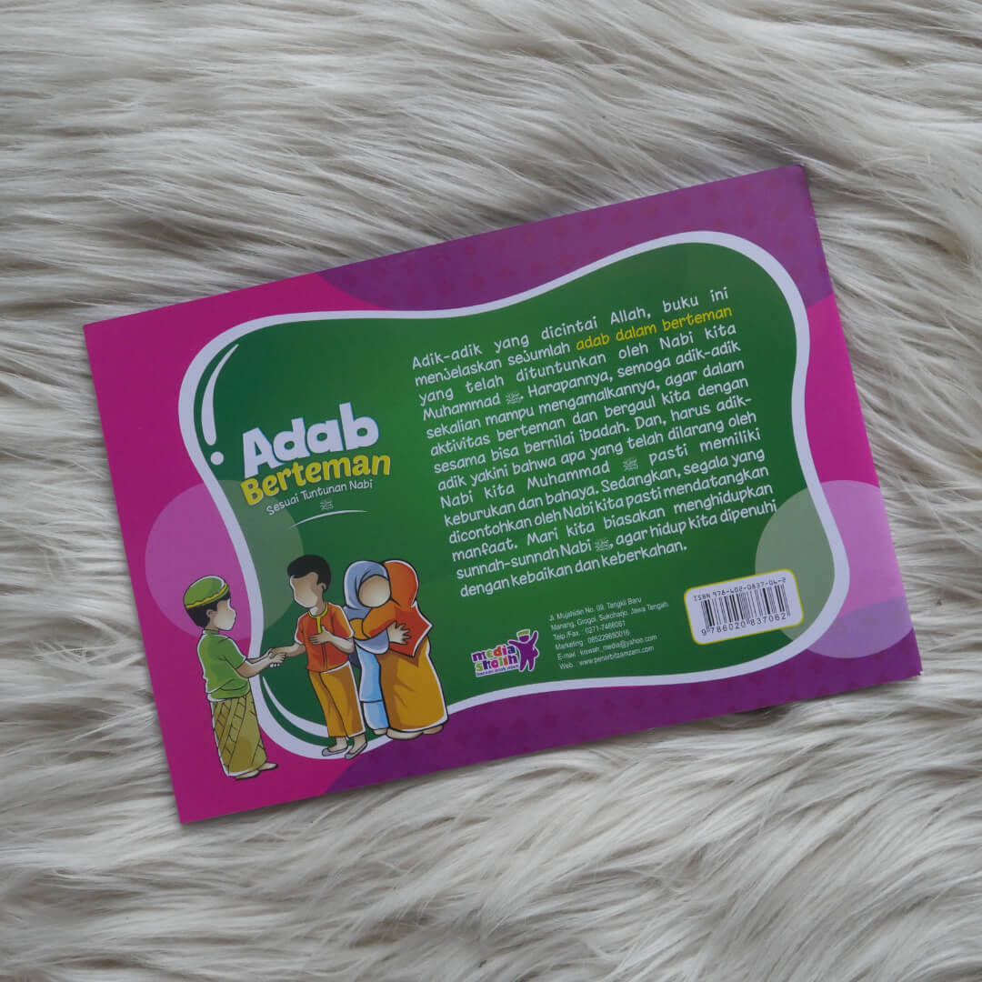 "Buku Adab Berteman Sesuai Tuntunan Nabi ini menjelaskan sejumlah adab dalam berteman dan bergaul sesuai dengan yang telah dituntunkan Rasulullah Muhammad Shallallahu ‘Alaihi Wasallam. Disajikan dengan bahasa sederhana dan mudah dimengerti serta dilengkapi dengan gambar-gambar berwarna yang menarik, membuat adik-adik tidak akan bosan dalam membaca dan belajar. Buku yang cocok digunakan sebagai referensi pokok dalam pembahasan pendidikan anak muslim.