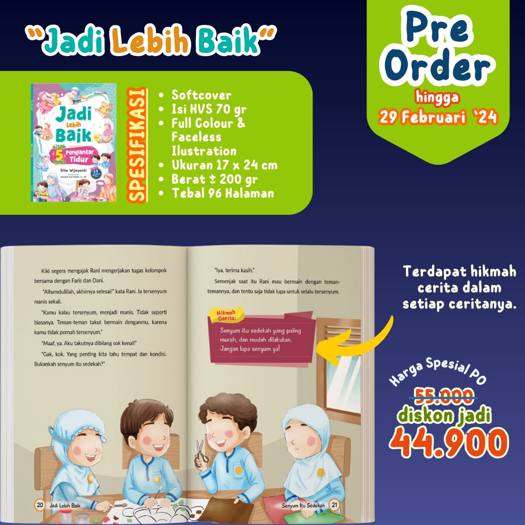 Buku "Kisah 5 Menit Pengantar Tidur: Jadi Lebih Baik" adalah kumpulan cerita anak Islami yang mengajarkan nilai-nilai akhlak mulia kepada anak-anak. Cerita-cerita dalam buku ini dikemas dengan cara yang menarik dan mudah dipahami oleh anak-anak, sehingga cocok untuk dijadikan sebagai cerita pengantar tidur.