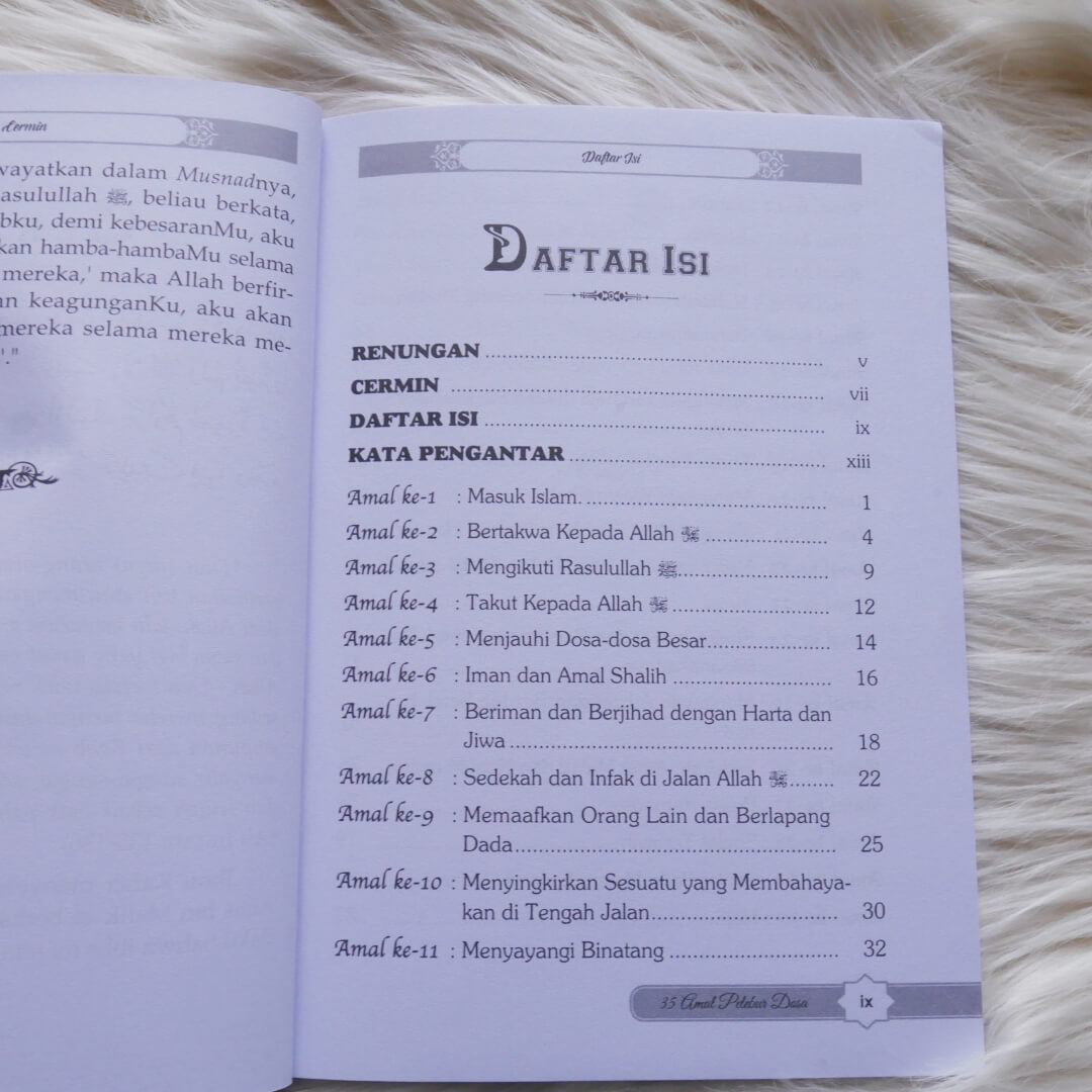 "Buku 35 Amal Pelebur Dosa ini membahas amalan ibadah dan amal shalih yang dapat menghapuskan dosa-dosa yang pernah kita lakukan. Pembahasanya disarikan dari Al-Qur’an dan Hadits Rasulullah Shalallahu ‘alaihi wa Sallam yang shahih, disampaikan dengan bahasa yang mudah dipahami. Buku ini layak dijadikan bacaan pokok untuk memompa semangat kita dalam beramal kebaikan untuk meraih ampunan Allah ta’ala.