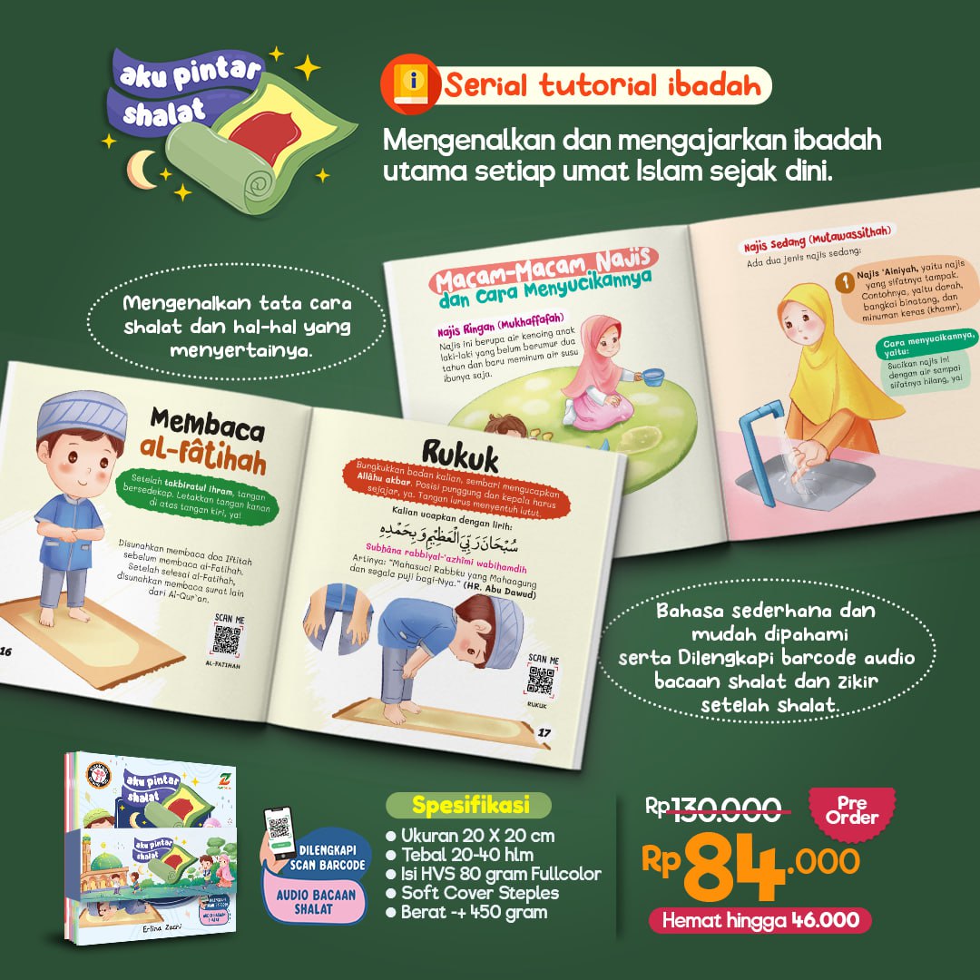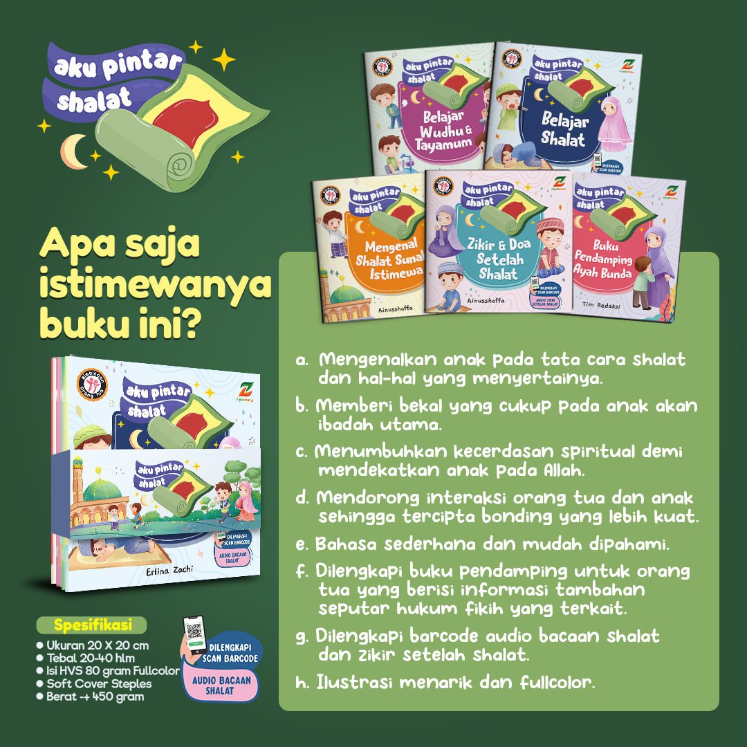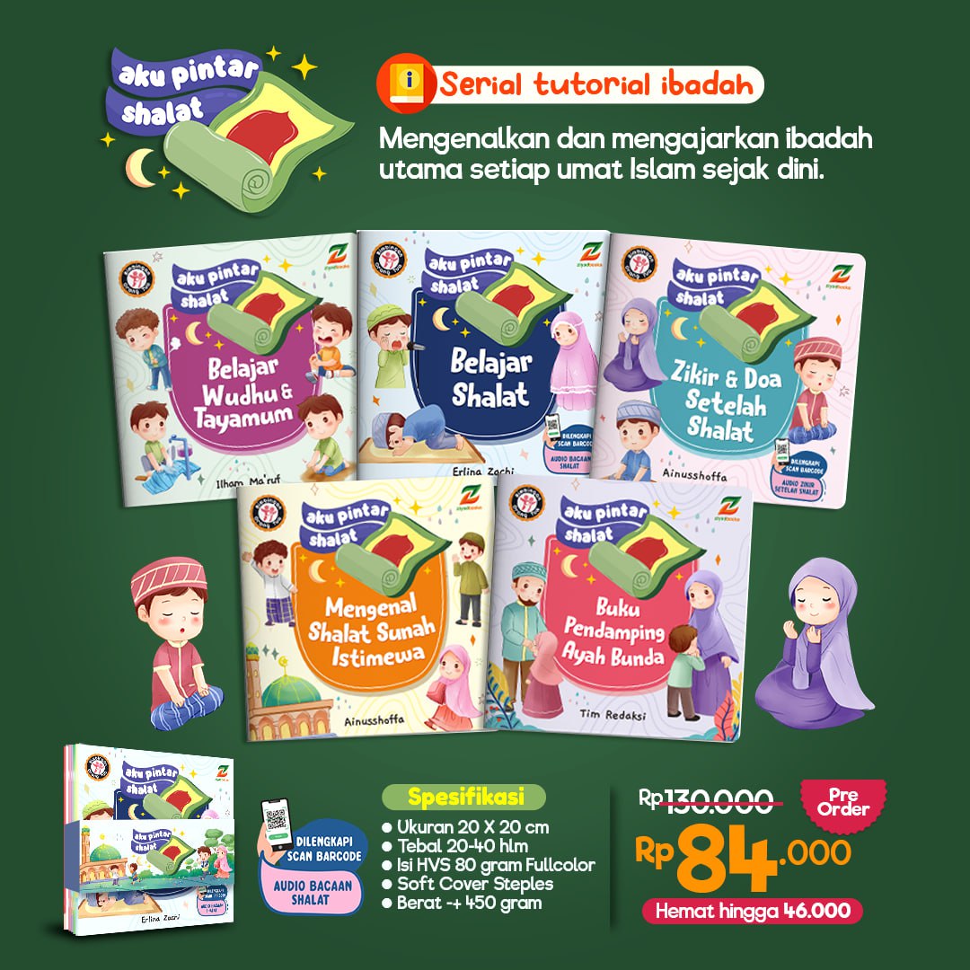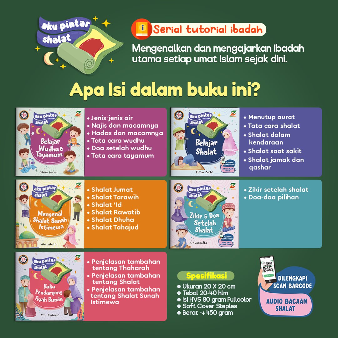 Paket buku ini berisi 5 buku dengan 4 tema utama, yakni Belajar Wudhu & Tayamum, Belajar Shalat, Mengenal Shalat Shalat Sunah Istimewa, serta Zikir dan Doa Setelah Shalat. Selain itu juga dilengkapi dengan Buku Pendamping Ayah Bunda yang berisi informasi seputar hukum fikih yang belum tercantum dalam 4 buku utama ????