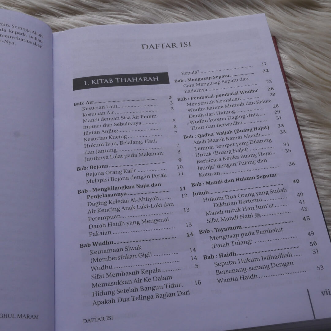 "Buku Bulughul Maram ini berisi hadits-hadits dari berbagai kitab induk utama seperti Shahih Bukhari, Shahih Muslim, Musnad Imam Ahmad, Sunan Ibnu Majah, Sunan At-Tirmidzi, dan yang lainnya. Pemulis menyusun materi pembahasan dalam buku ini secara tematik berdasarkan bab-bab fiqih dimulai dari bab Bersuci (Thaharah) sampai bab Kelengkapan (Al-Jamf). Kitab Bulughul Maram ini sangat layak dibaca dan dijadikan referensi untuk belajar hukum-hukum islam.