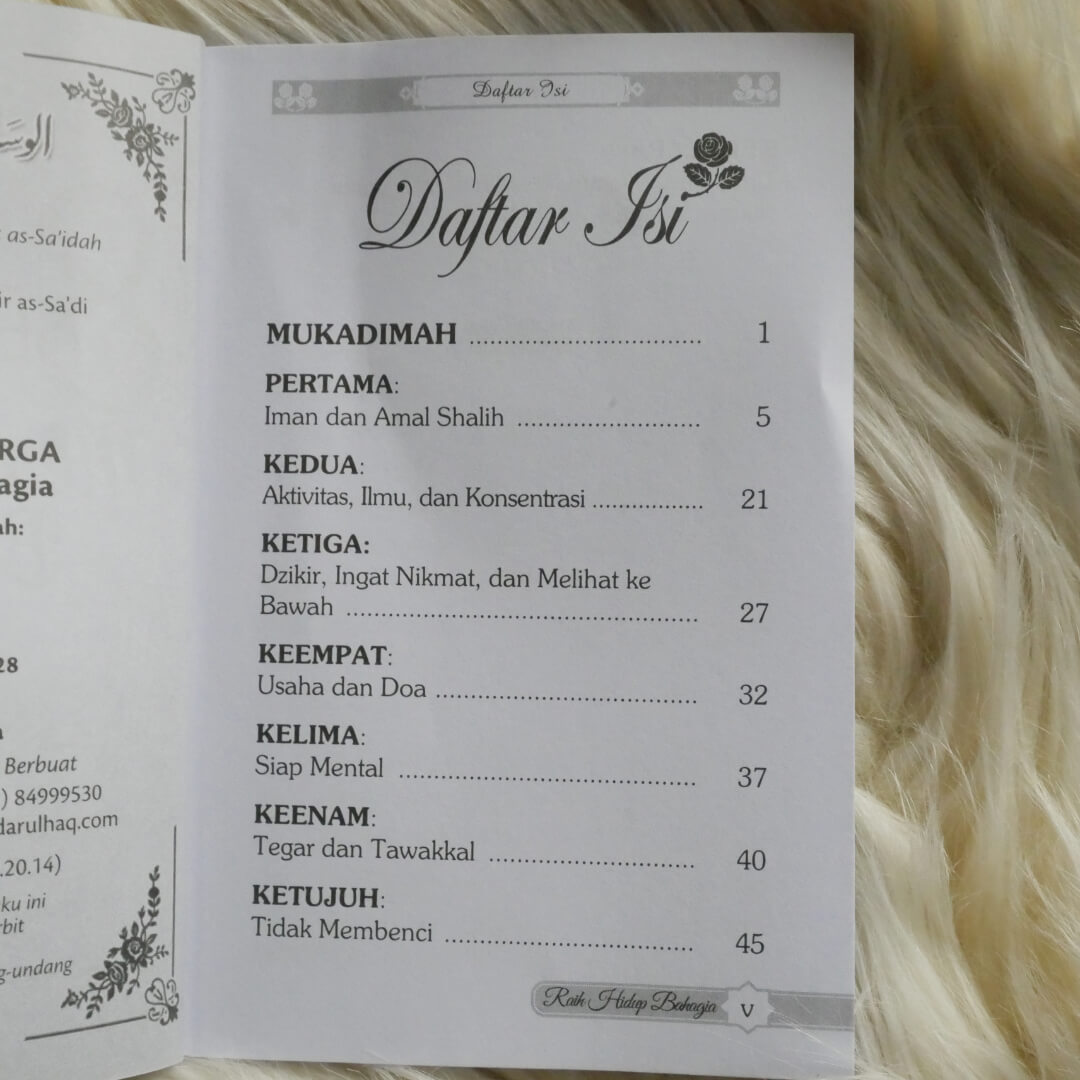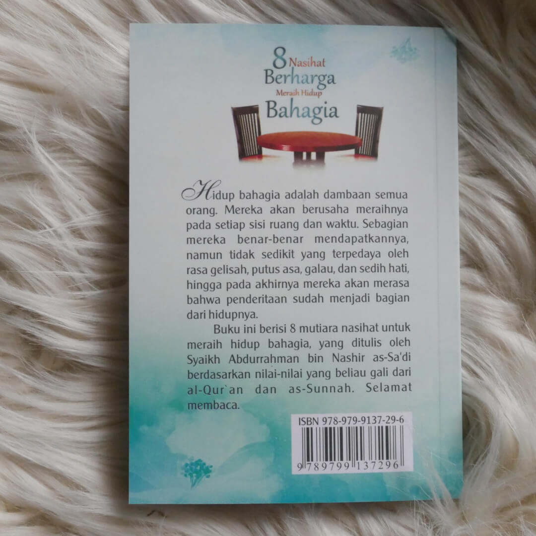 Buku ini berisi 8 mutiara nasihat untuk meraih hidup bahagia, yang ditulis Syaikh Abdurrahman bin Nashir as-Sa’di berdasarkan nilai-nilai yang beliau gali dari al-Qur’an dan as-Sunnah. selamat membaca