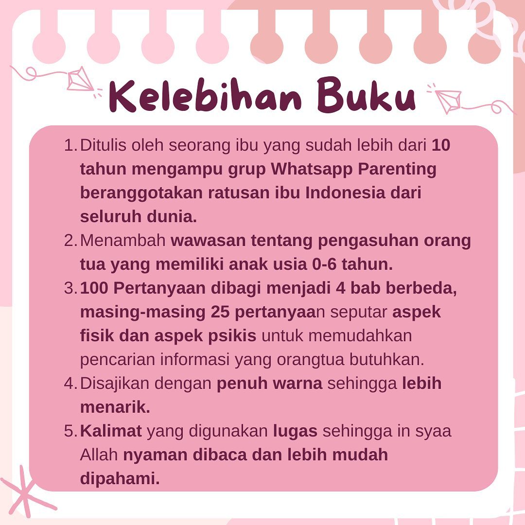 - Kalau buku sebelumnya membahas tentang aspek fisik, buku baru ini berisi kompilasi pertanyaan seputar perkembangan psikis, seperti cara mengendalikan emosi, metode belajar, bersosialisasi, & sibling rivalry yang terjadi setiap hari.