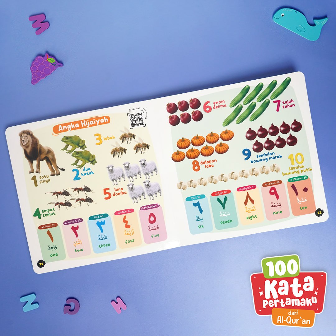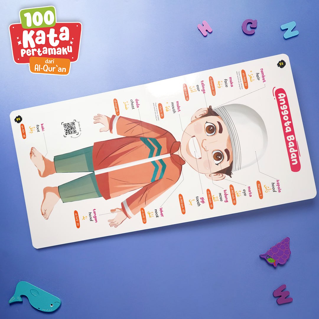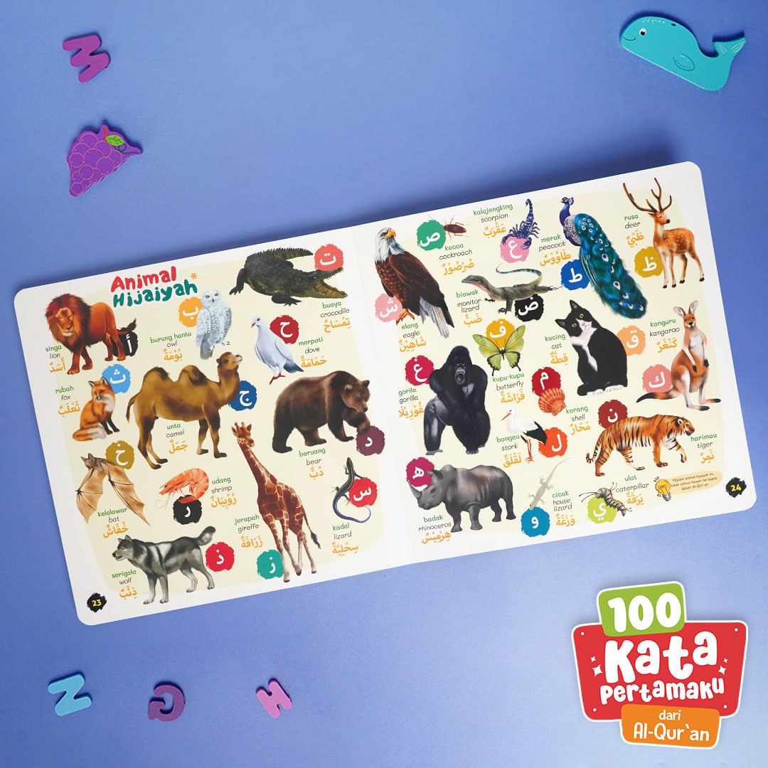 Terdapat 100 kata yang dikenalkan, seperti : benda-benda di sekitar, hewan, buah, sayuran, bentang alam, fenomena alam, aktivitas ibadah, anggota badan, dan lainnya. Masing-masing gambar dilengkapi dengan kosa kata Bahasa Indonesia, Bahasa Inggris, dan Bahasa Arab.