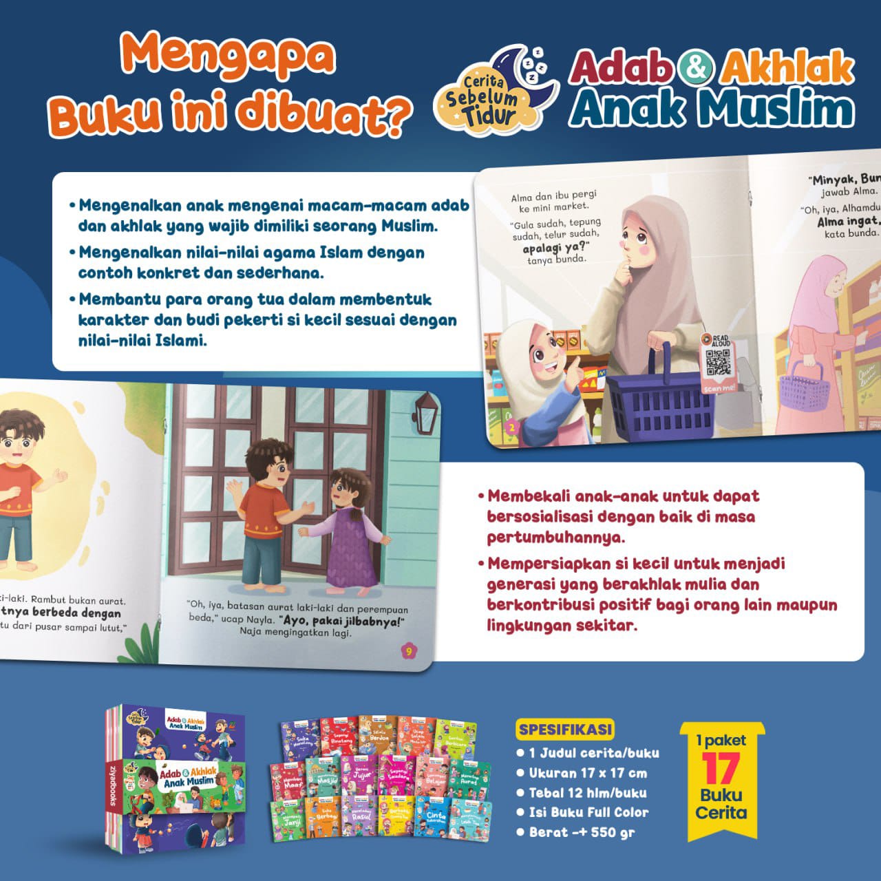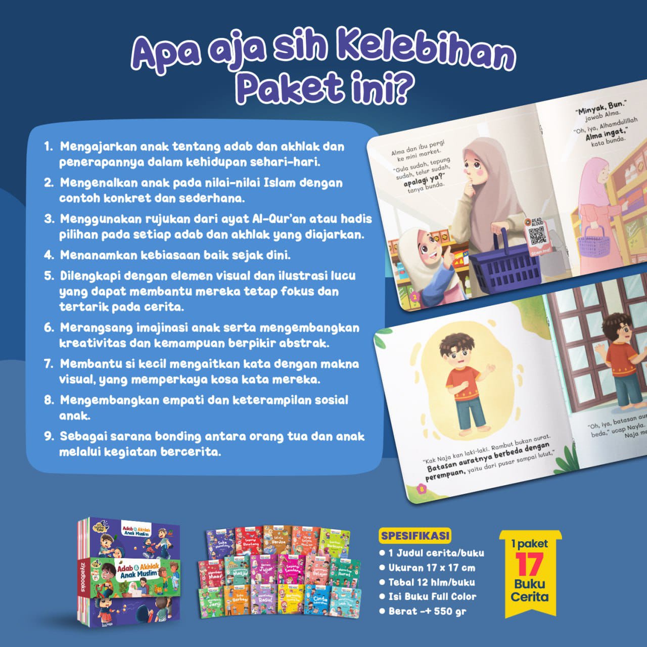 Dalam satu paket berisi 17 buku yang mengenalkan 17 adab dan akhlak sehari-hari. Dikemas dalam bentuk cerita dengan bahasa yang sederhana sehingga selaras dengan keseharian anak.