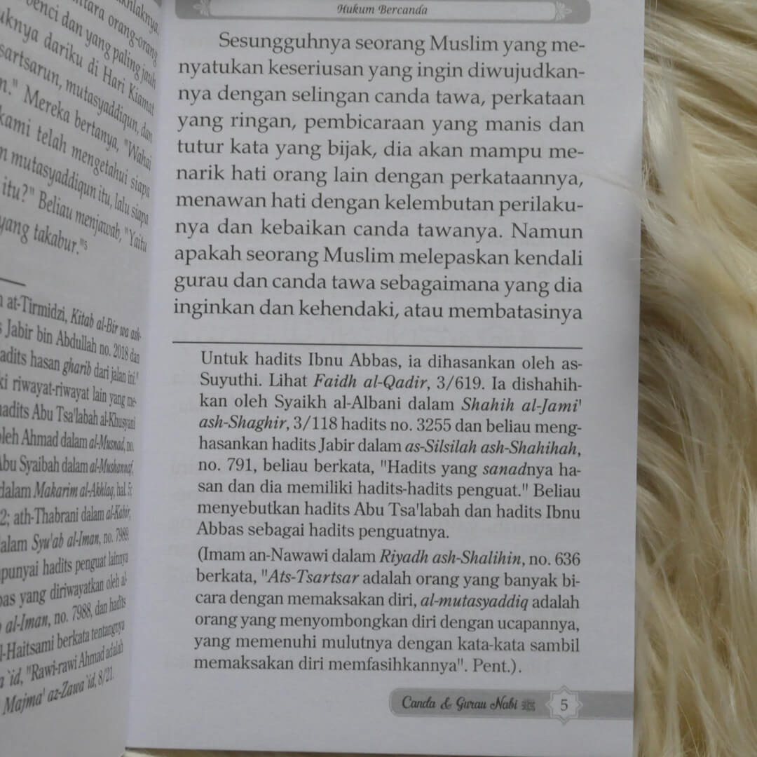 "Buku Canda dan Gurau Nabi ini menampilkan fikih bergurau dan bercanda yang dipraktekkan Nabi Shalallahu ‘alaihi wa Sallam, baik kepada keluarga beliau, kepada anak-anak maupun kepada para Shahabat radhiyallahu ‘anhum. Buku ini akan memberikan nasehat kepada kita semua agar tidak berlebihan dalam bercanda serta tidak sampai melanggar larangan Allah ta’ala. Buku ini layak dibaca untuk menjadi pengingat kita dari batasan syariat tentang bercanda dan bergurau.