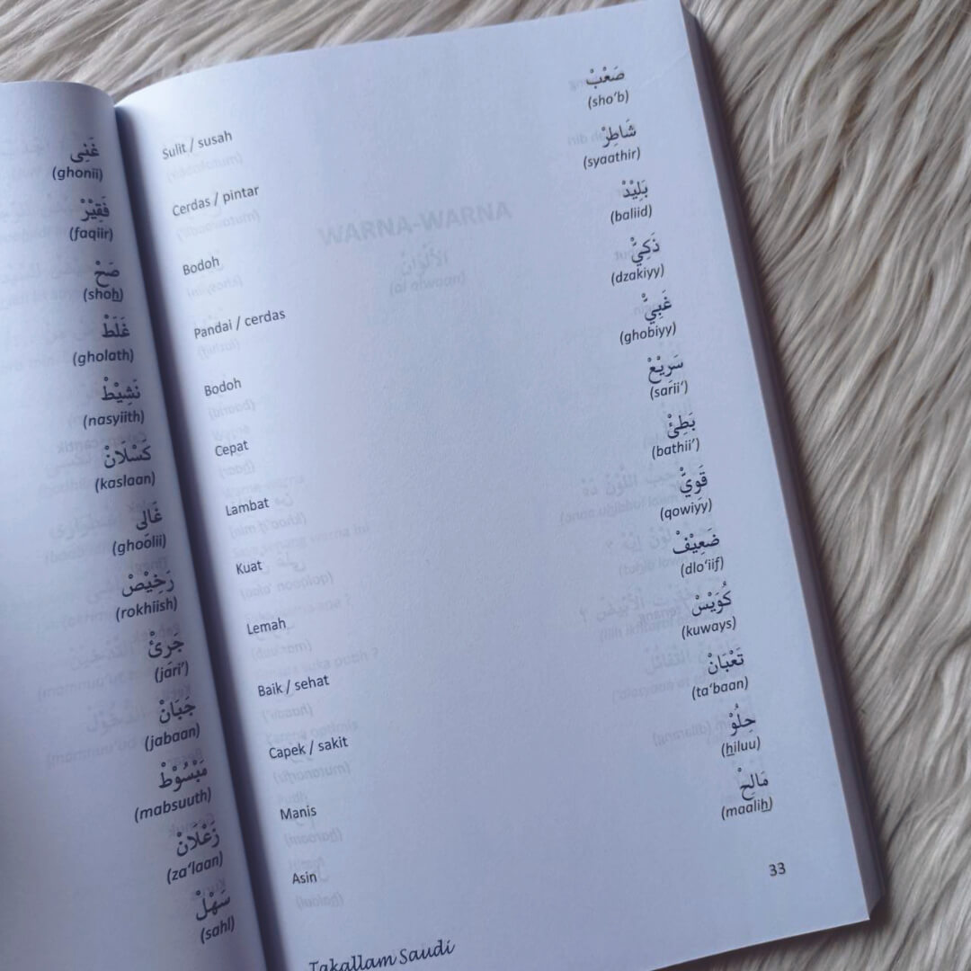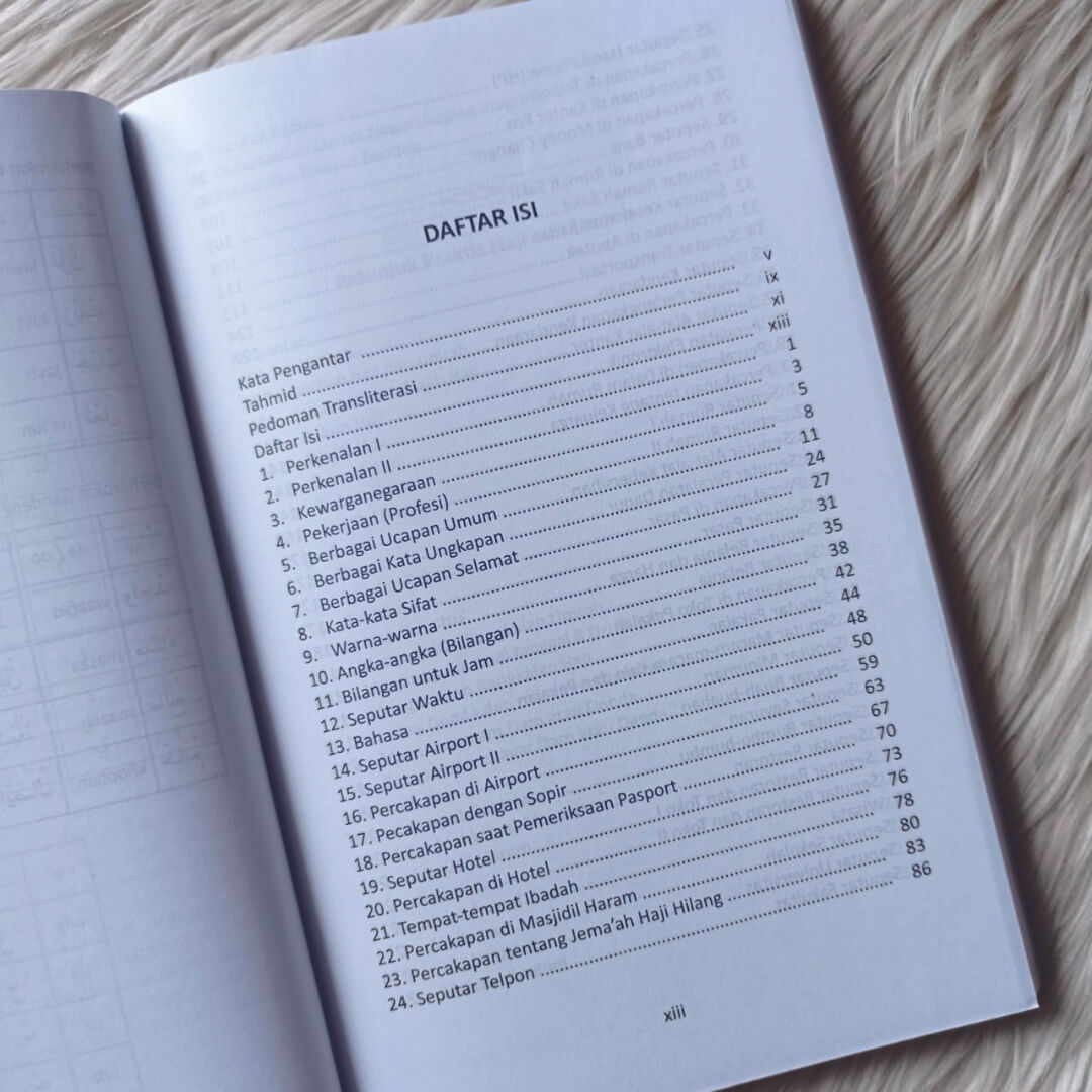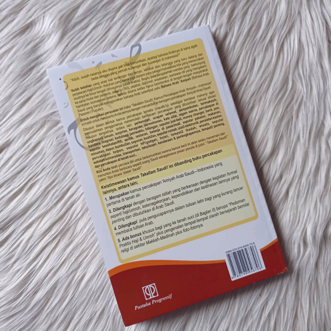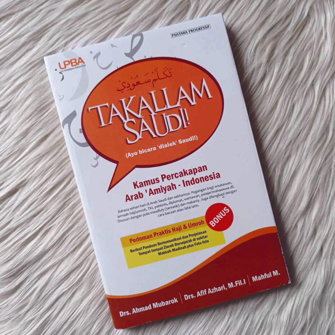 Buku ini di susun dengan tema tematik dan tempat, juga dilengkapi dengan cara bacaan atau lafal latin. Buku Takallam Saudi ini juga dilengkapi bonus pedoman praktis haji dan umroh berikut panduan berkomunikasi dan penjelasan tempat-tempat ziarah bersejarah di sekitar Makkah – Madinah plus foto-foto penunjangnya.