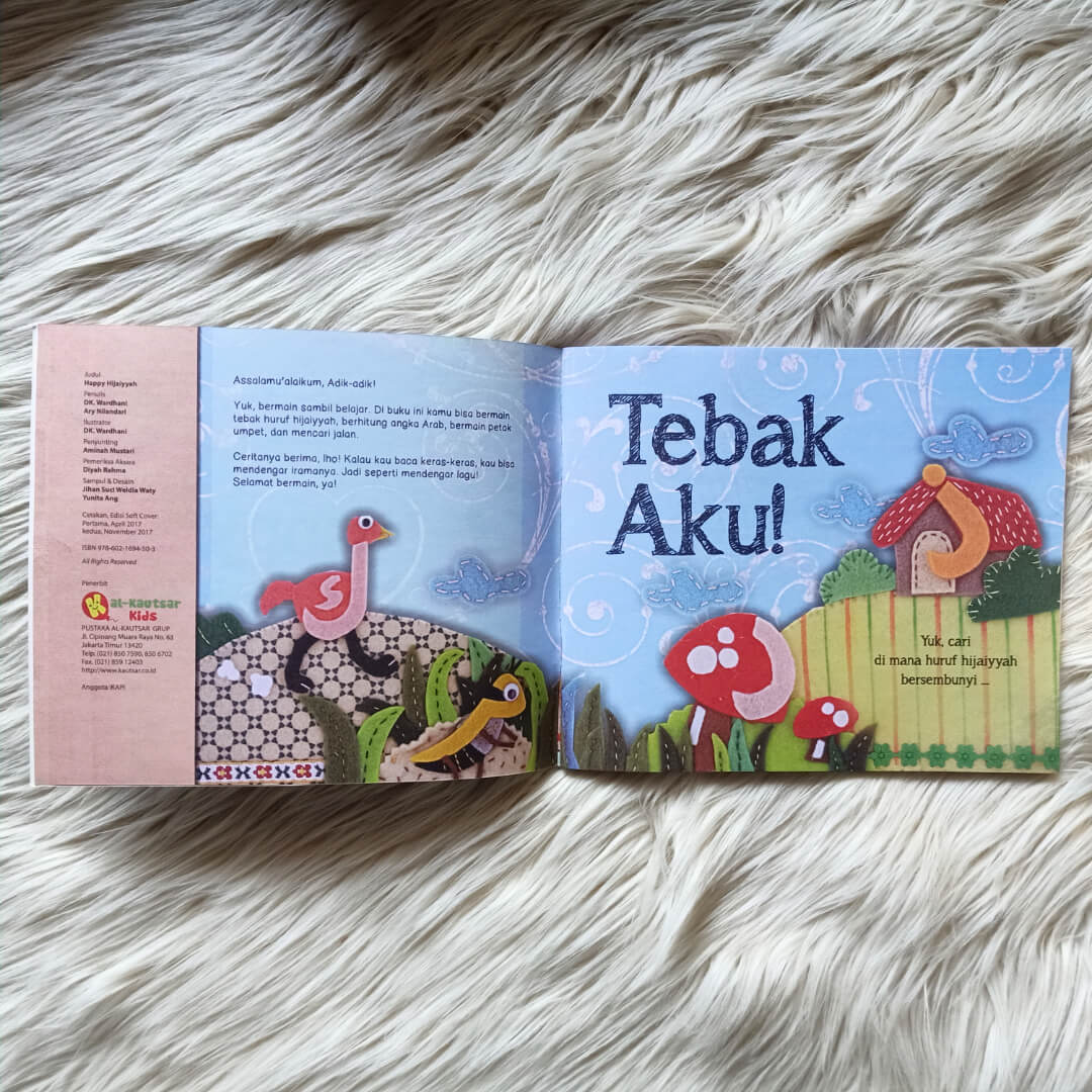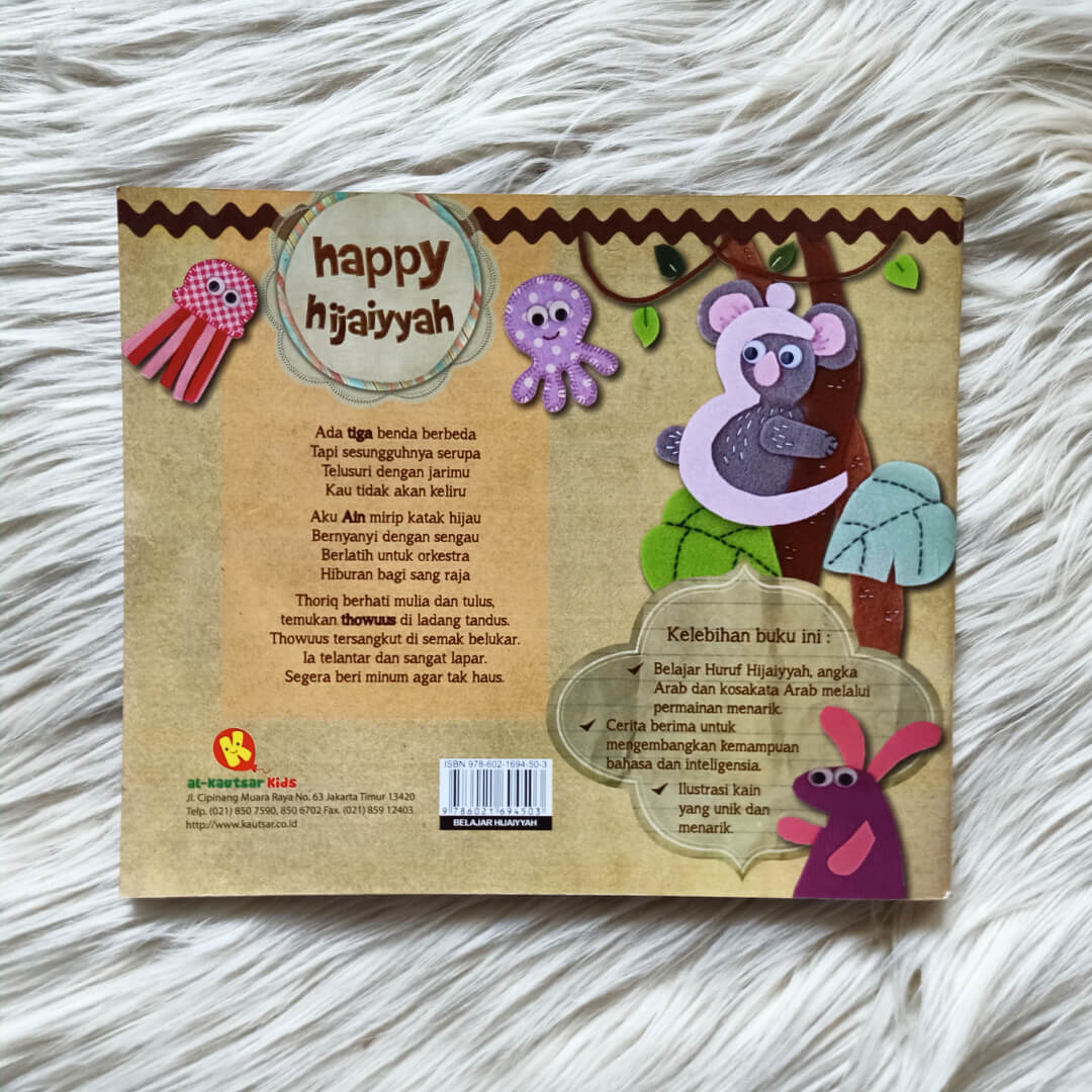 Buku Happy Hijaiyyah ini berisi kumpulan huruf hijaiyyah, angka dan kosakata Arab untuk dipelajari anak-anak dalam upayanya belajar membaca Al-Qur’an. Dituturkan dengan cara yang menarik, sehingga membuat anak tidak bosan dalam membaca dan belajar.