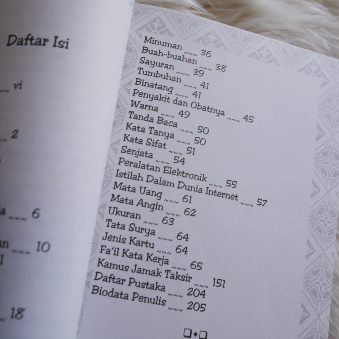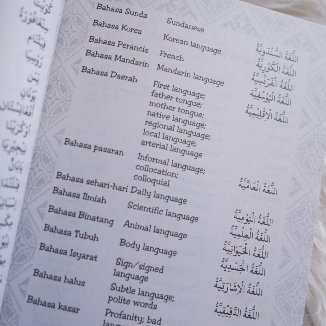 Buku ini memuat kosa kata dan ungkapan 3 bahasa yakni: Arab-Indonesia-Inggris dalam berbagai situasi dan kondisi untuk membantu anda berkomunikasi, yang tak sekedar terjemah kata.