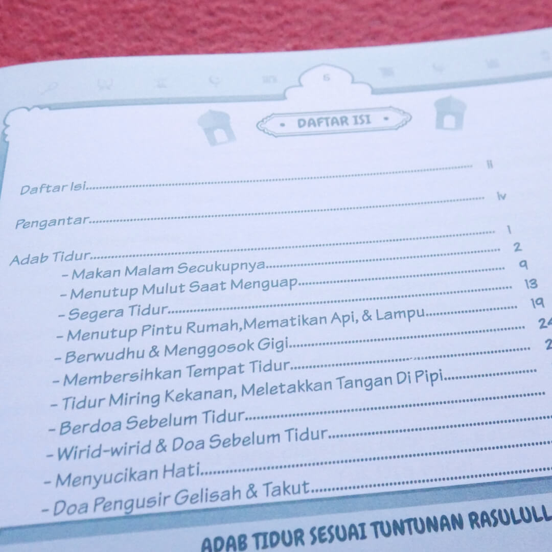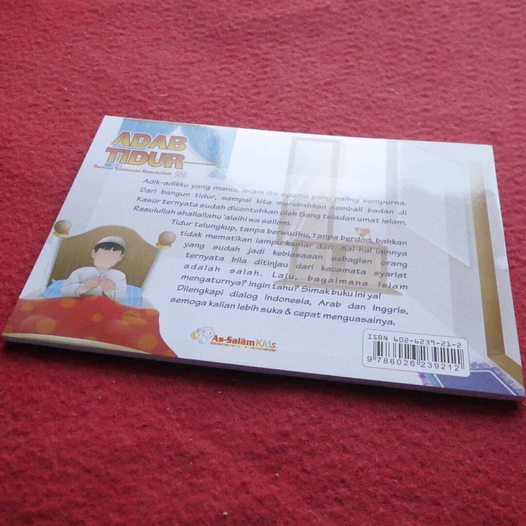 Buku ini berjudul “Buku Anak Adab Tidur Sesuai Tuntunan Rasulullah” , Dengan buku ini, Ayo kita belajar adab yang telah diajarkan Nabi, buku penting ini bagus buat anak anak,mari ajarkan mereka bagaimana Rasulullah shalallahu alaihi wa salamtidur, yang sehat dan berpahala juga agar kelak anak-anak kita tumbuh dengan akhlak yang baik.