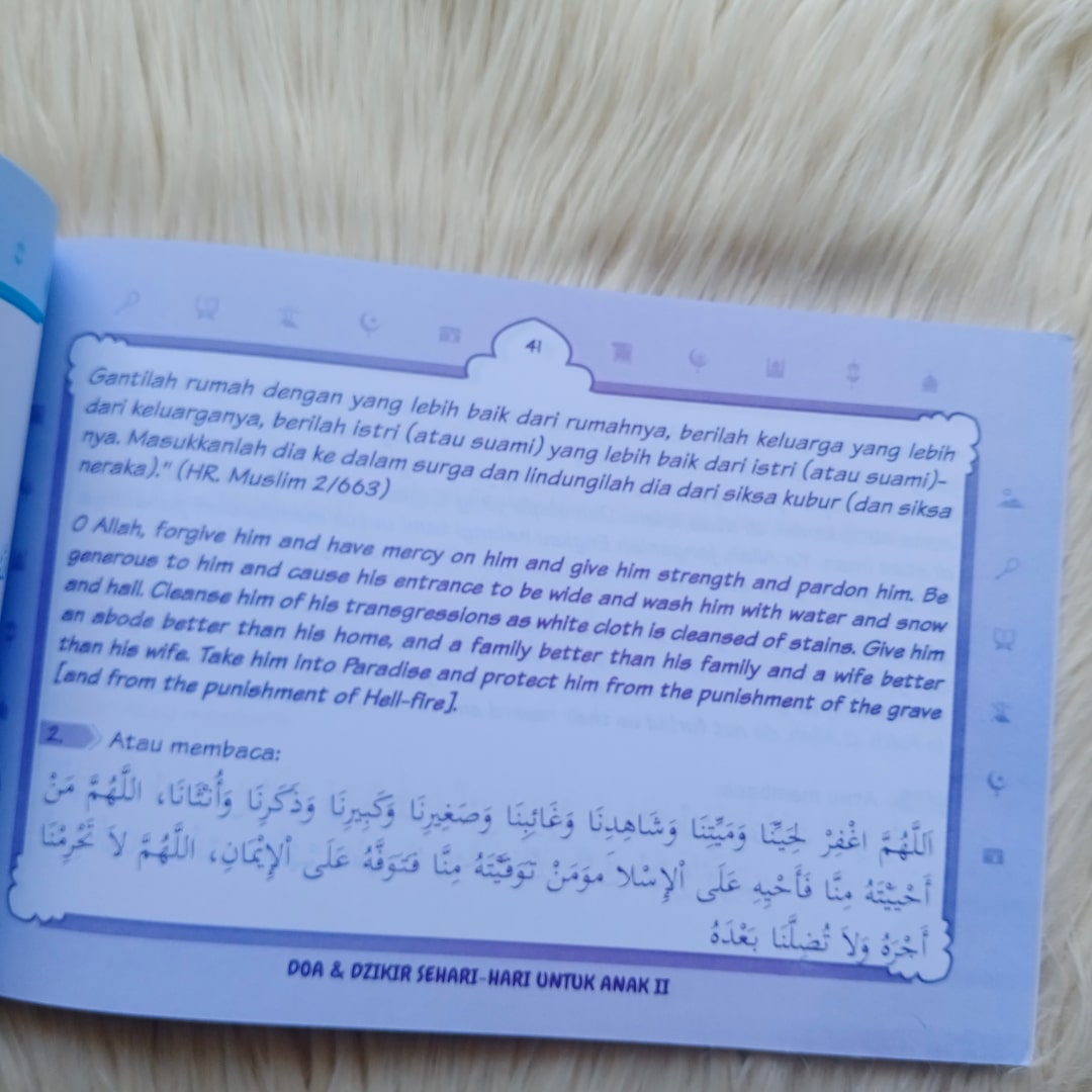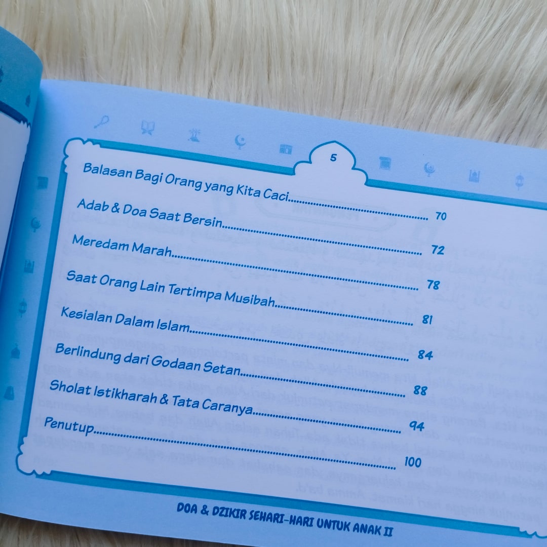 Buku kecil ini memuat tuntunan dzikir dan doa sehari-hari berdasar Al Quran dan Sunnah yang disusun di atas lembaran berwarna yang disukai oleh anak.Di Setiap doa disertai dengan gambar ilustrasi yang menarik