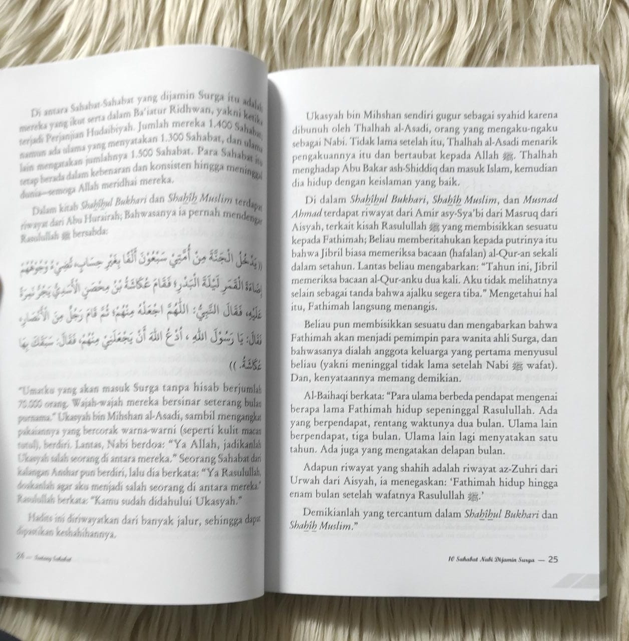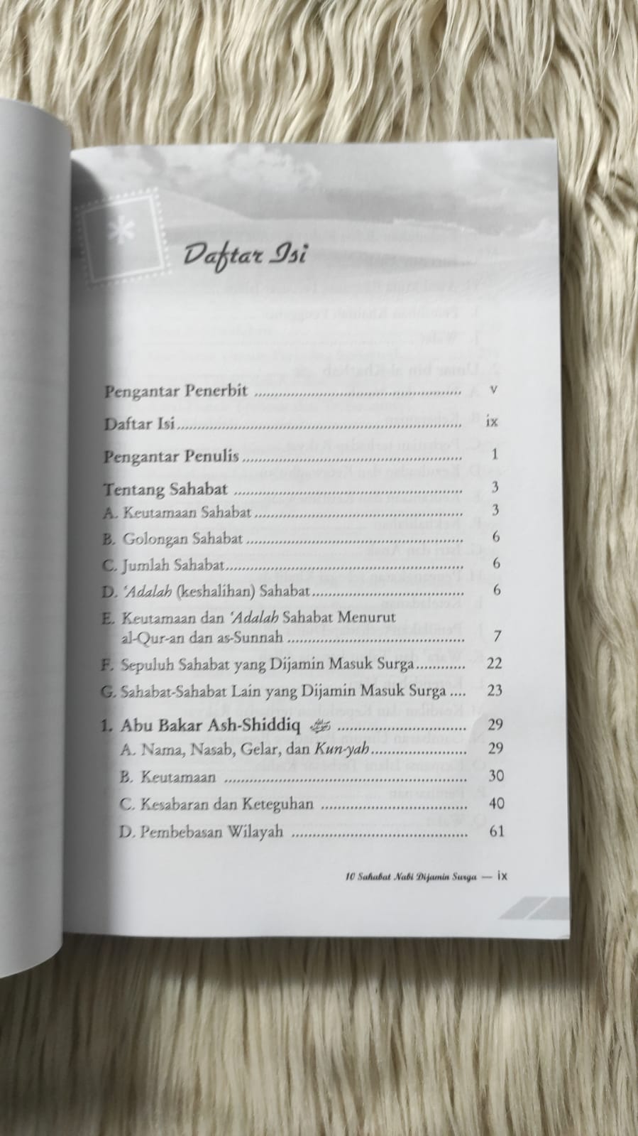 "Buku 10 Shahabat yang Dijamin Masuk Surga ini menyajikan kisah dan biografi 10 sahabat Rasulullah Shallallahu ‘Alaihi wa Sallam yang dalam satu hadits, mereka disebutkan akan masuk surga . Para shahabat tersebut adalah para shahabat pilihan dikalangan kaum Quraisy, dikalangan pemeluk Islam generasi awal, dikalangan muhajirin, dikalangan pasukan perang Badr, dan dikalangan pembai’at Rasulullah Shallallahu ‘Alaihi wa Sallam. Buku ini sangat cocok untuk motivasi kita untuk meneladani keimanan, amal shalih dan kesungguhan para shahabat pilihan untuk membela islam dan syariatNya.