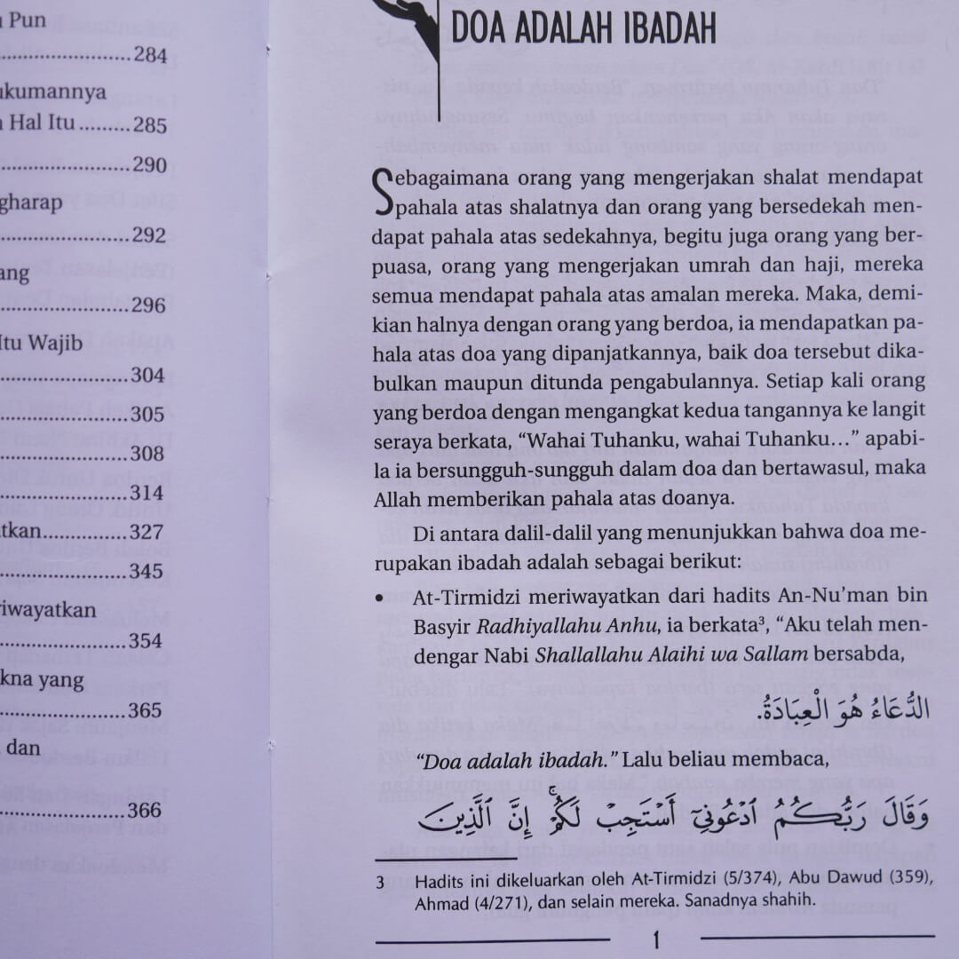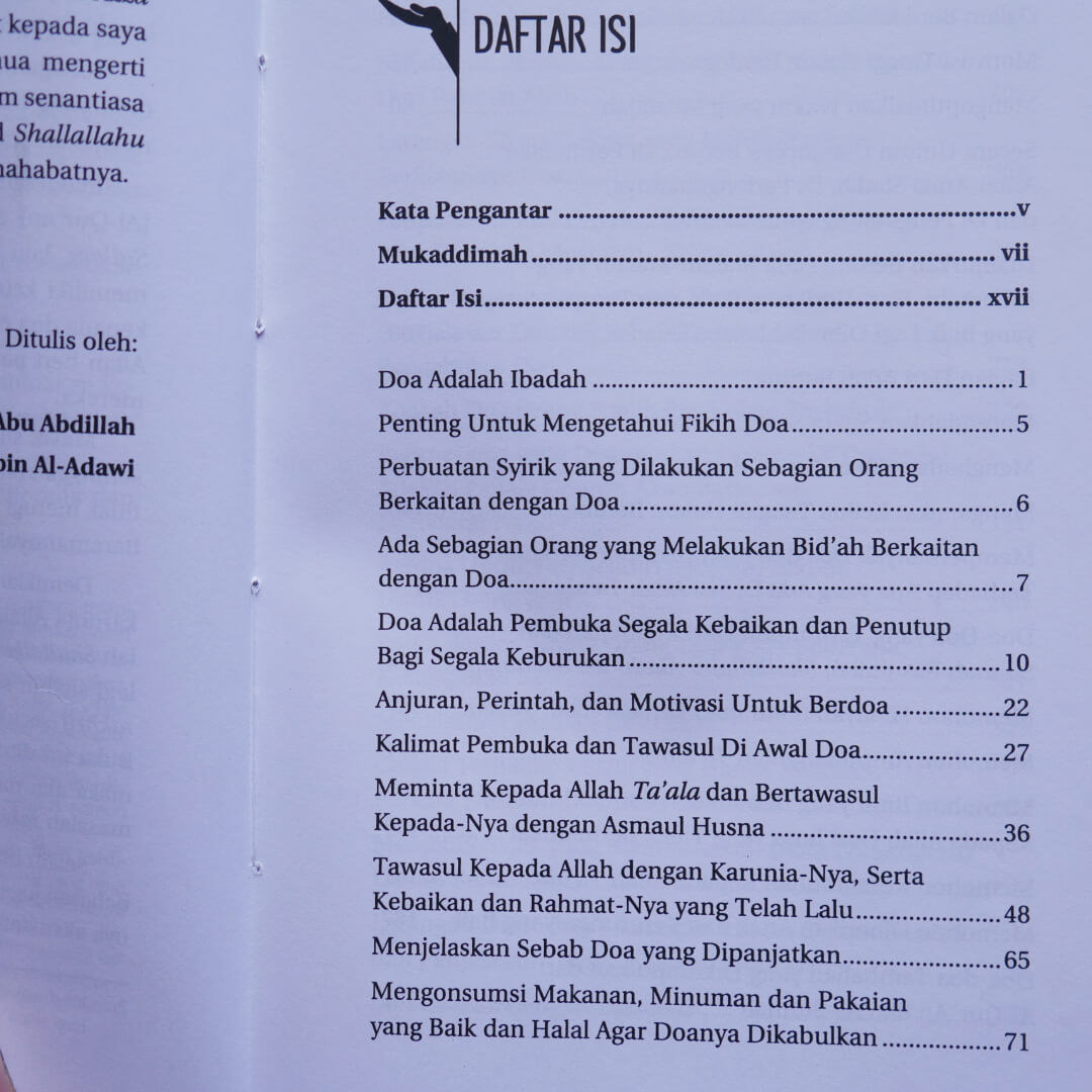 "Buku Fikih Doa di hadapan Anda ini menguraikan tuntunan lengkap dalam berdo’a kepada Allah ta’ala. Kemudian juga menjelaskan tentang keutamaan berdo’a, tata cara berdo’a, adab-adab dalam berdoa, pengaruh do’a, bentuk dan lafal do’a, hukum yang berkaitan dengan do’a, dan masih banyak hal lain yang dipaparkan dalam buku yang bermanfaat ini. Ditulis secara lengkap dan teratur berdasarkan dalil dari AlQur’an dan hadits-hadits Nabi Shalallahu ‘alaihi wa Sallam.