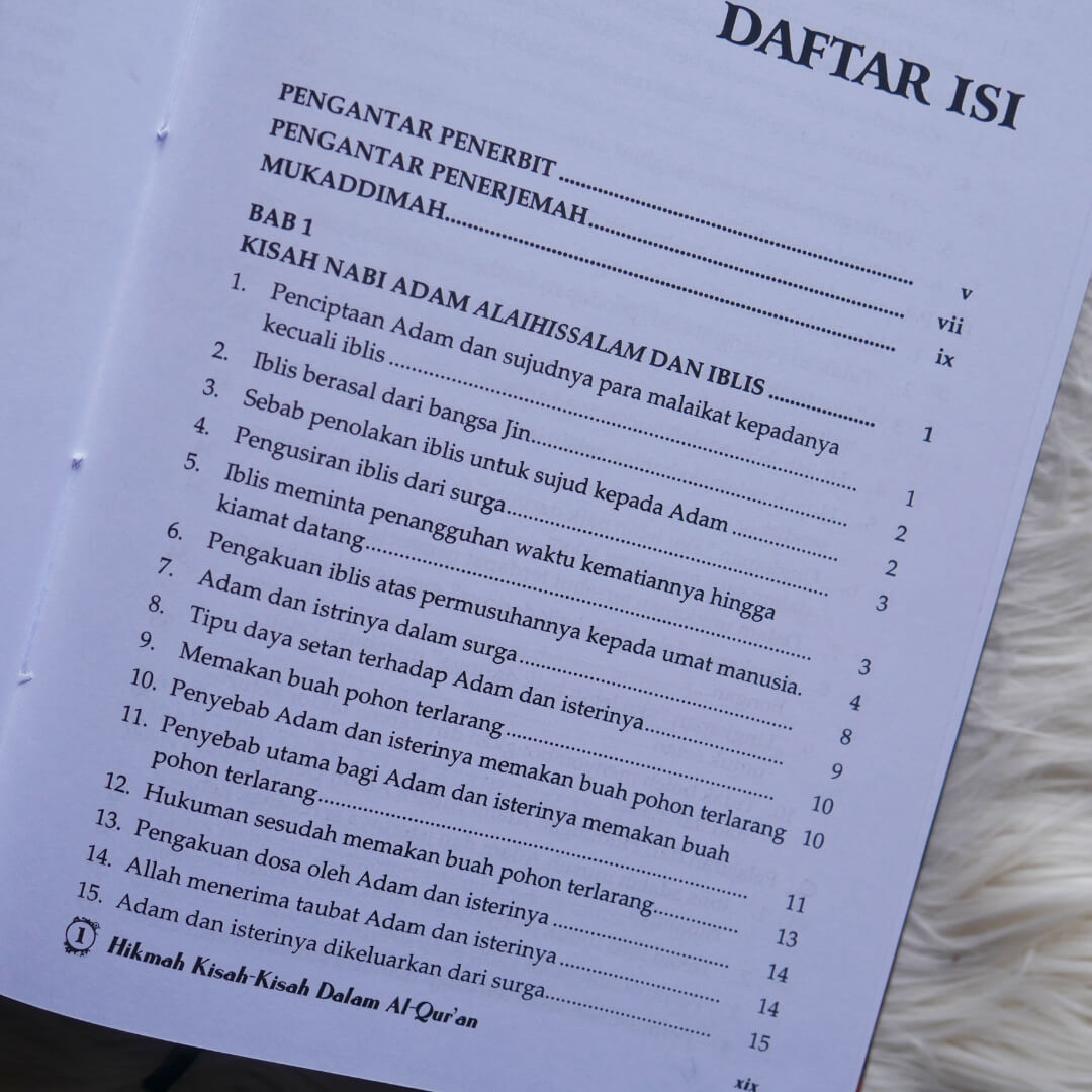 Buku Hikmah Kisah-Kisah Dalam Al-Qur’an Jilid Pertama menyajikan kisah para Nabi dan Rasul di tengah-tengah kaumnya sejak Nabi Adam ‘alaihissalam sampai Nabi Isa ‘alaihissalam. Selain itu juga menguraikan kisah penuh hikmah dari Luqman Al-Hakim, Fir’aun, Qarun, Ashabul Kahfi, Dzul Qarnain, Ashabul Qaryah, Ashabul Ukhdud, dan kisah-kisah yang lainnya. Kemudian penulis menjabarkan pelajaran dan hikmah yang terdapat dalam ayat-ayat tersebut.