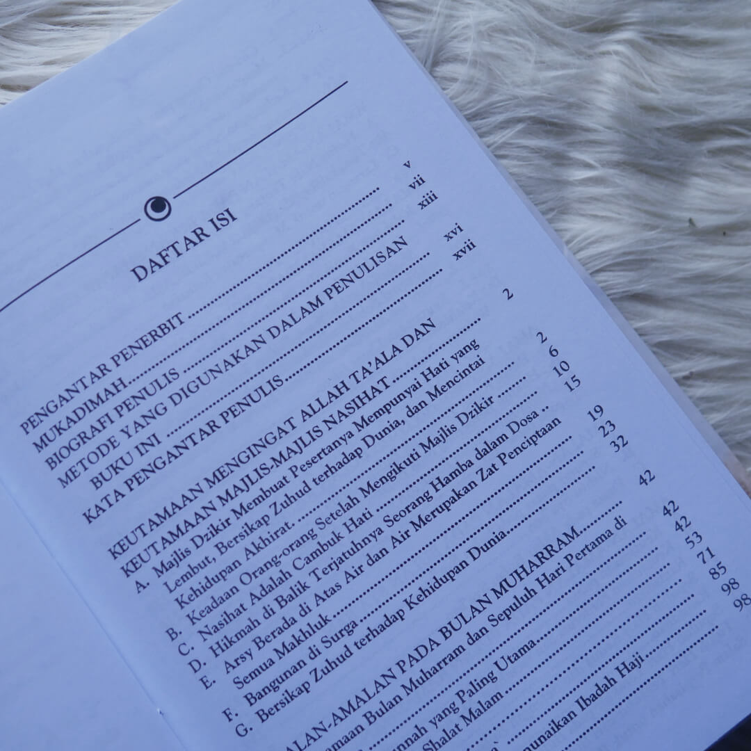 Penulis membuka pembahasannya dengan bab keutamaan majlis dzikir (mengingat Alloh) dan keutamaan majlis ilmu, serta menutupnya dengan pembahasan taubat. Buku ini ibarat nasehat sepanjang masa, karena mengupas amalan-amalan sunnah selama setahun menurut penanggalan hijriyah, yakni mulai bulan Muharram hingga Dzul Hijjah. Namun, dari kedua belas bulan tersebut, ada tiga bulan yang tidak masuk bab pembahasan (Rabi’ul akhir, Jumadil ula, dan Jumadil akhir) karena tidak adanya amalan khusus yang berkaitan dengan bulan tersebut. Tetapi, penulis menambahkan tiga pembahasan yakni: musim semi, musim dingin dan musim panas.