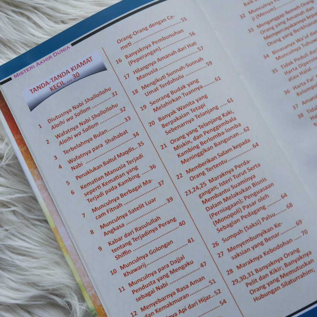 Diantara pembahasan yang disajikan dalam buku Misteri Akhir Dunia ini adalah Mengapa Kita Membahas Tanda Tanda Hari Kiamat, Kaidah-Kaidah Dalam Memahami Tanda-Tanda Hari Kiamat, Kaidah Dalam Mengaitkan Antara Nash-Nash Tentang Tanda-Tanda Hari Kiamat Dengan Kejaidn Dan Peristiwa Yang Terjadi Dalam Kehidupan Ini, Makna Tanda-Tanda Kiamat, Tanda-Tanda Kiamat Besar dan Tanda-Tanda Kiamat Kecil. Selamat menyimak