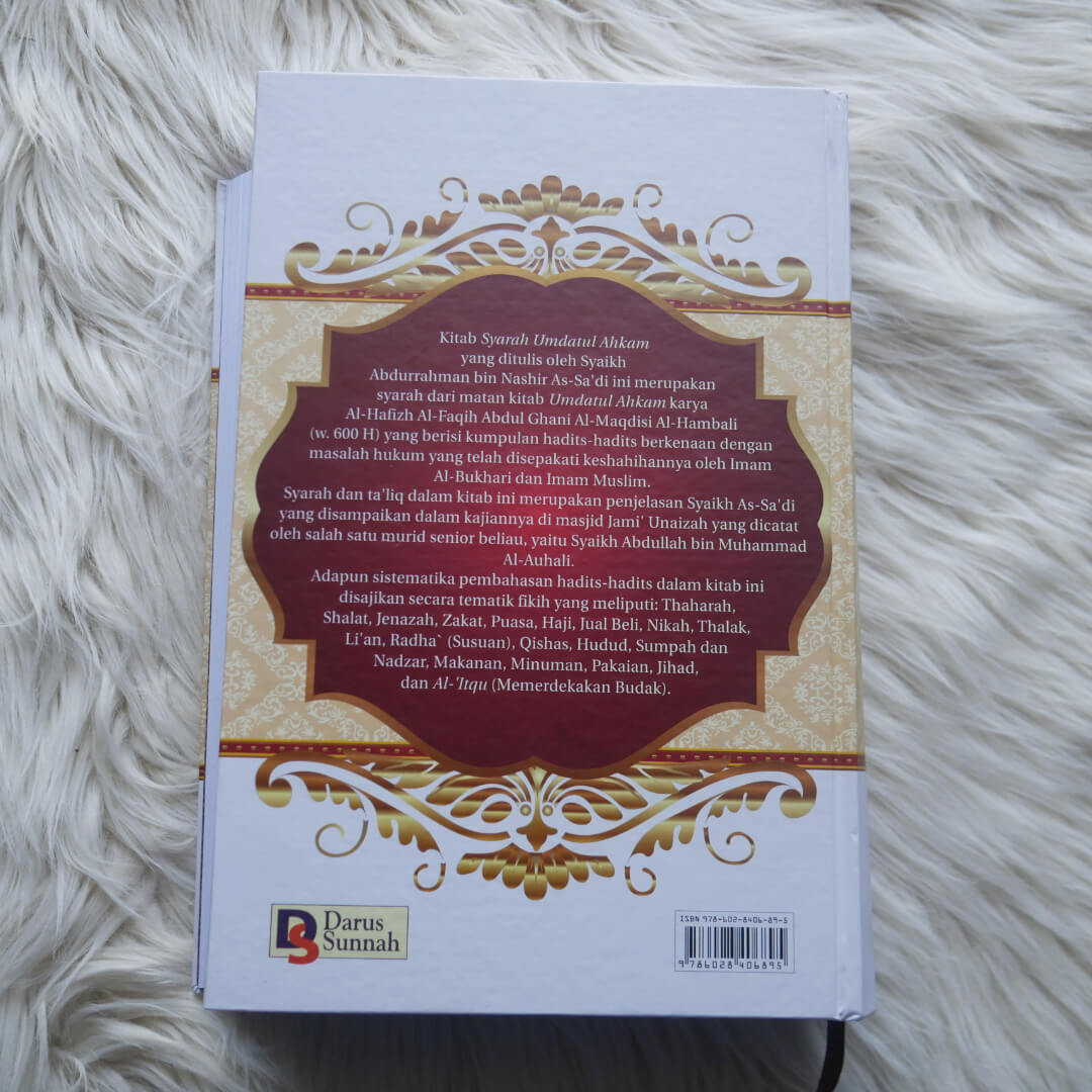 "Buku Syarah Umdatul Ahkam ini merupakan terjemahan dari kitab Syarh Umdatul Ahkam buah karya Syaikh Abdurrahman bin Nashir As-Sa’di yang merupakan syarah dari matan kitab Umdatul Ahkam karya Al-Hafidz Abdul Ghani Al-Maqdisi Al-Hambali. Buku ini menyajikan kumpulan hadits-hadits hukum yang telah disepakati keshahihannya oleh Imam Al- Bukhari dan Imam Muslim.