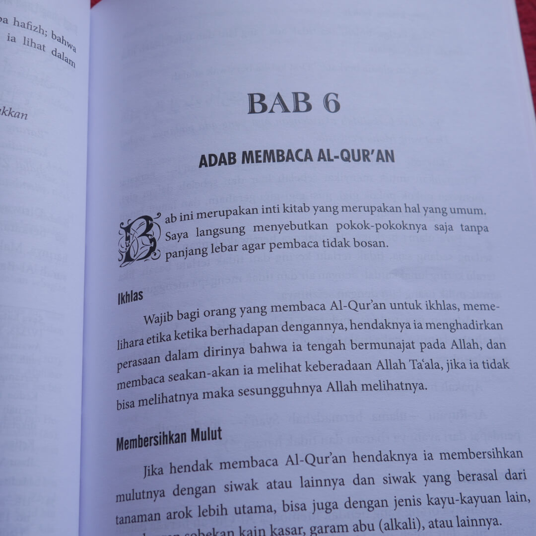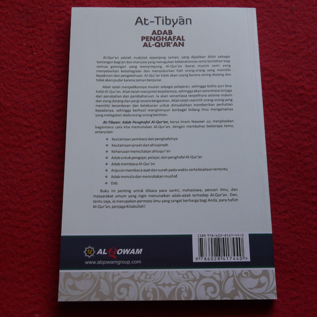 "Buku At Tibyan Adab Penghafal Al Qur’an ini merupakan terjemah dari tulisan Imam an-Nawawi yang terkenal di kalangan penuntut ilmu, at-Tibyan fi Adab Hamalatil Quran, di dalamnya Imam Nawawi menjelaskan panjang lebar bagaimana adab yang harus ditempuh oleh seorang penghafal al-Quran al-Karim.