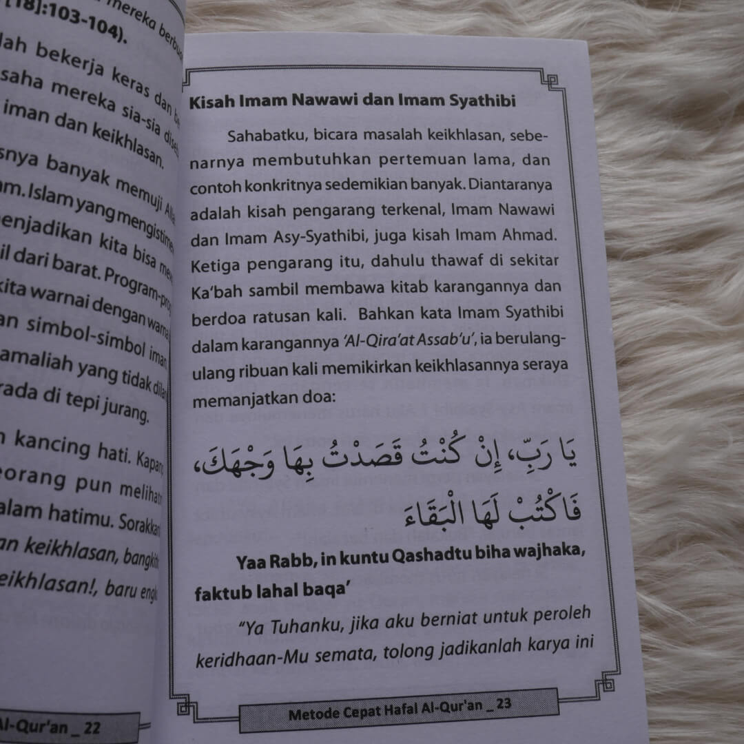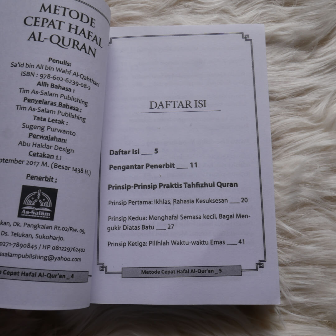 "Buku Saku Metode Cepat Hafal Al-Qur’an di hadapan Anda ini menjelaskan tips-tips sederhana untuk menghafalkan Al-Qur’an dengan cepat dan kuat serta disertai motivasi-motivasi yang mengagumkan. Kita tahu bersama bahwa menghafal Al-Qur’an adalah amalan yang sangat tinggi nilainya. Tentunya setiap muslim menginginkannya. Terlebih lagi manfaat yang didapatkan berupa ketenangan hati, kejernihan pikiran dan kebeningan jiwa. Buku saku ini sangat layak dijadikan pedoman ringkas untuk menambah hafalan Al-Qur’an.