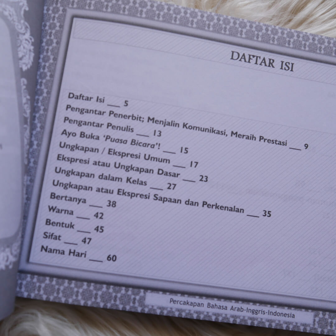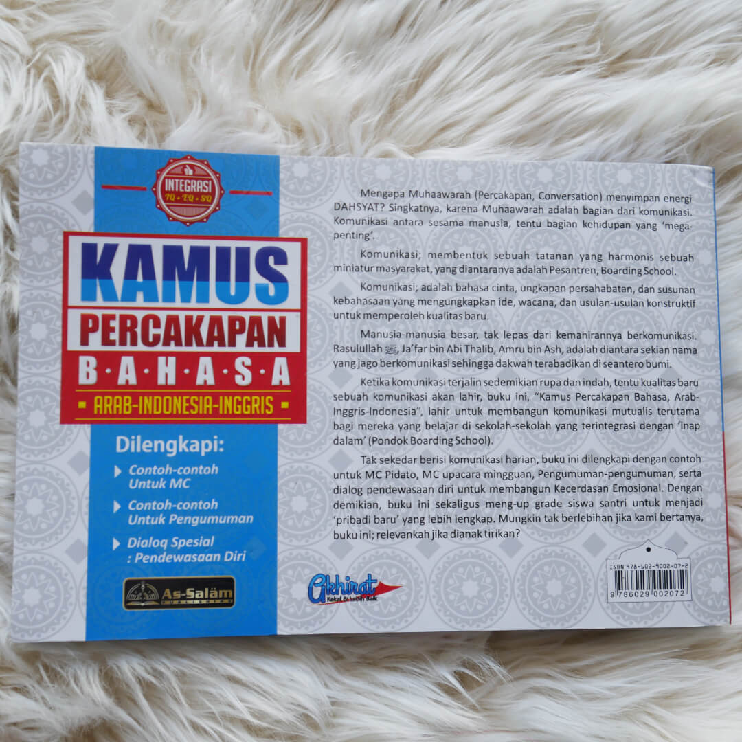"Buku ini Buku Kamus Percakapan Bahasa Arab-Indonesia-Inggris yang tak sekedar terjemah kata, namun dilengkapi pula dengan contoh untuk MC Pidato, MC upacara mingguan, pengumuman-pengumuman, serta dialog pendewasaan diri untuk membangun kecerdasan emosional. Dengan demikian buku ini sekaligus meng-up grade siswa santri untuk menjadi ‘pribadi baru’ yang lebih lengkap.