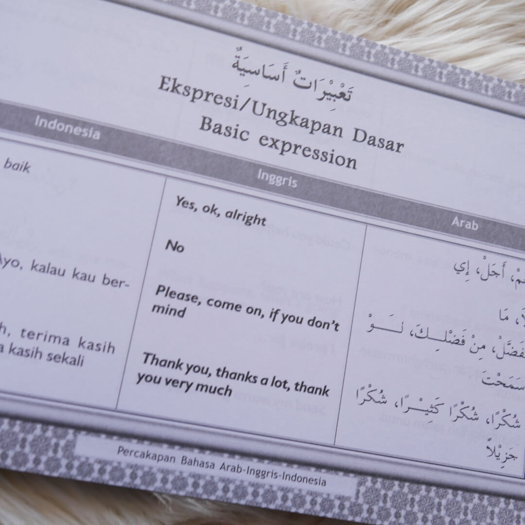 Buku Kamus Percakapan Bahasa Arab-Indonesia-Inggris ini kami sajikan, untuk mengasah, memompa, dan menggerinda ketajaman kemampuan komunikasi para siswa. Sehingga semenjak dini mereka terbiasa menyerap ilmu pengetahuan dari teman, guru, sekaligus dari para tutor yang bersama mereka; para siswa bergaul.