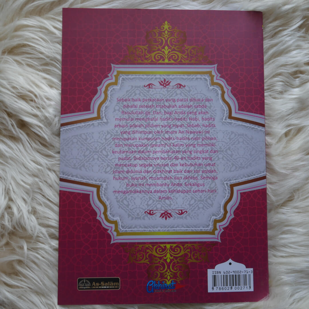 Buku ini berjudul “Buku Saku Matan Hadits Arbain Imam An-Nawawi” , Buku ini merupakan salah satu karya Imam An-Nawawi. Merupakan kumpulan hadits-hadits Nabi pilihan, dan merupakan jawami’ul kalim yang memiliki keutamaan dalam pembahasan yang singkat dan padat. Di dalamnya berisi 40-an hadits yang mencakup segala urusan dan kebutuhan umat Islam di dunia dan di akhirat, baik di sisi akidaH, muamalah, hukum, syari’ah, dan akhlak.