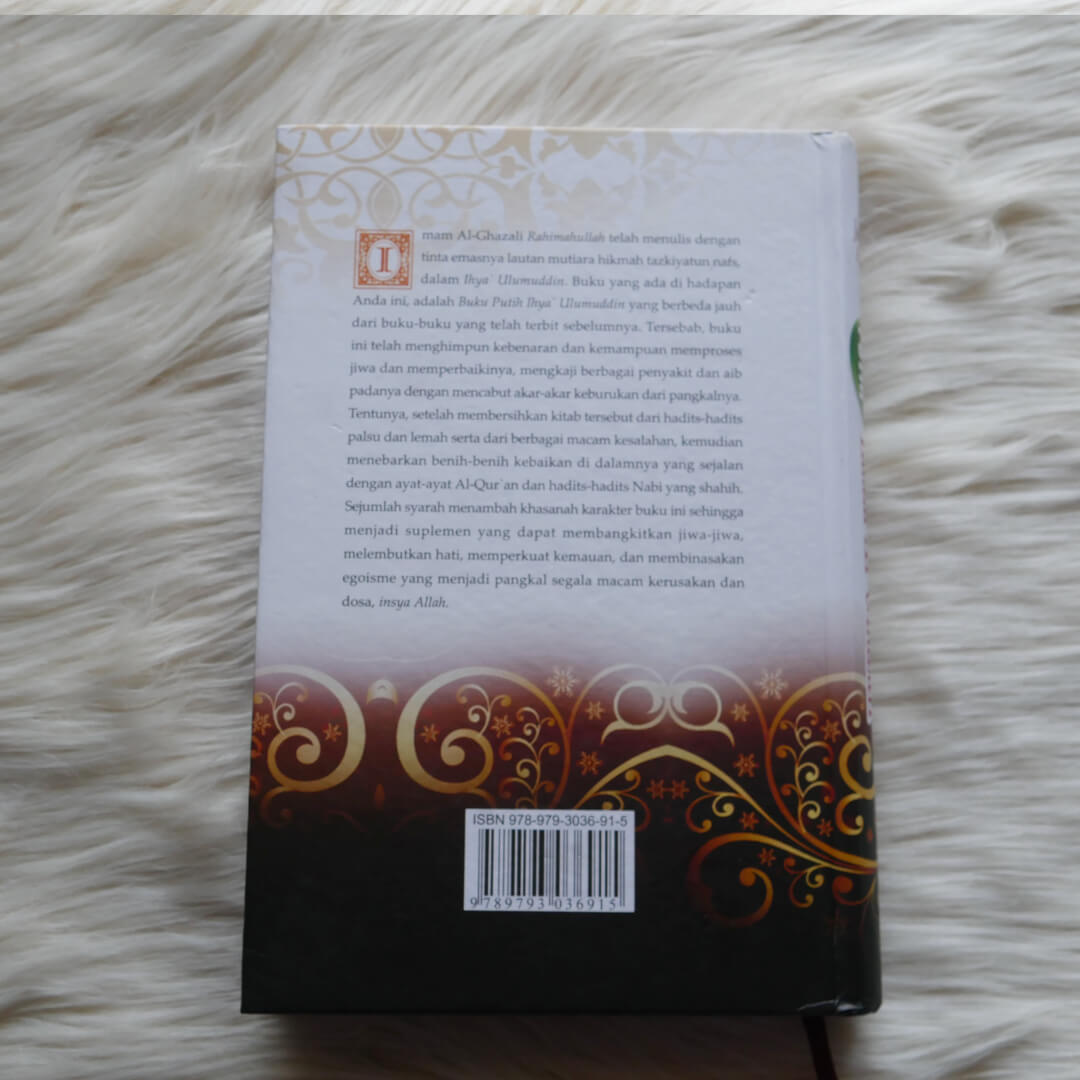 "Buku Putih Ihya Ulumuddin Imam Ghazali yang ada di hadapan Anda ini, adalah Buku Putih Ihya Ulumuddin, yang berbeda jauh dari buku-buku yang telah terbit sebelumnya. Sebelumnya, Imam Al-Ghazali rahimahullah telah menulis dengan tinta emasnya lautan mutiara hikmah tazkiyatun nafs, dalam kitabnya Ihya Ulumuddin. Buku Putih Ihya Ulumuddin Imam Ghazali ini telah menghimpun kebenaran dan kemampuan memproses jiwa dan memperbaikinya, mengkaji berbagai penyakit dan aib padanya dengan mencabut akar-akar keburukan dari pangkalnya.