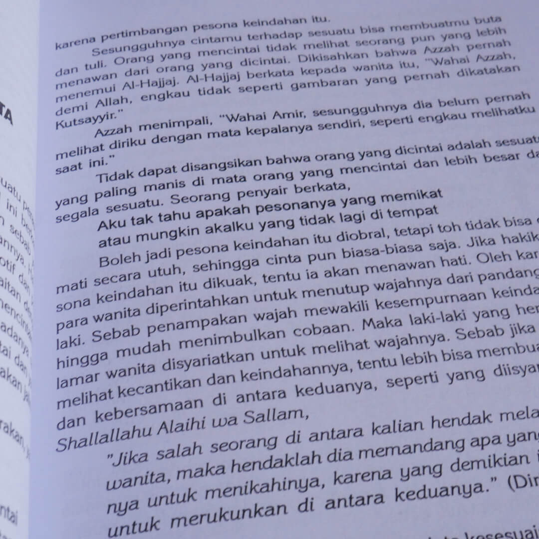 Di antaranya ia berkata. “Cinta merupakan cermin bagi seseorang yang sedang jatuh cinta untuk mengetahui watak dan kelemah-lembutan dirinya dalam citra kekasihnya. Karena sebenarnya, ia tidak jatuh cinta kecuali terhadap dirinya sendiri. “Buku ini layak dikonsumsi semua jenjang usia. sangat membantu dalam urusan agama yang dapat mendatangkan kemaslahatan di dunia dan akhirat.