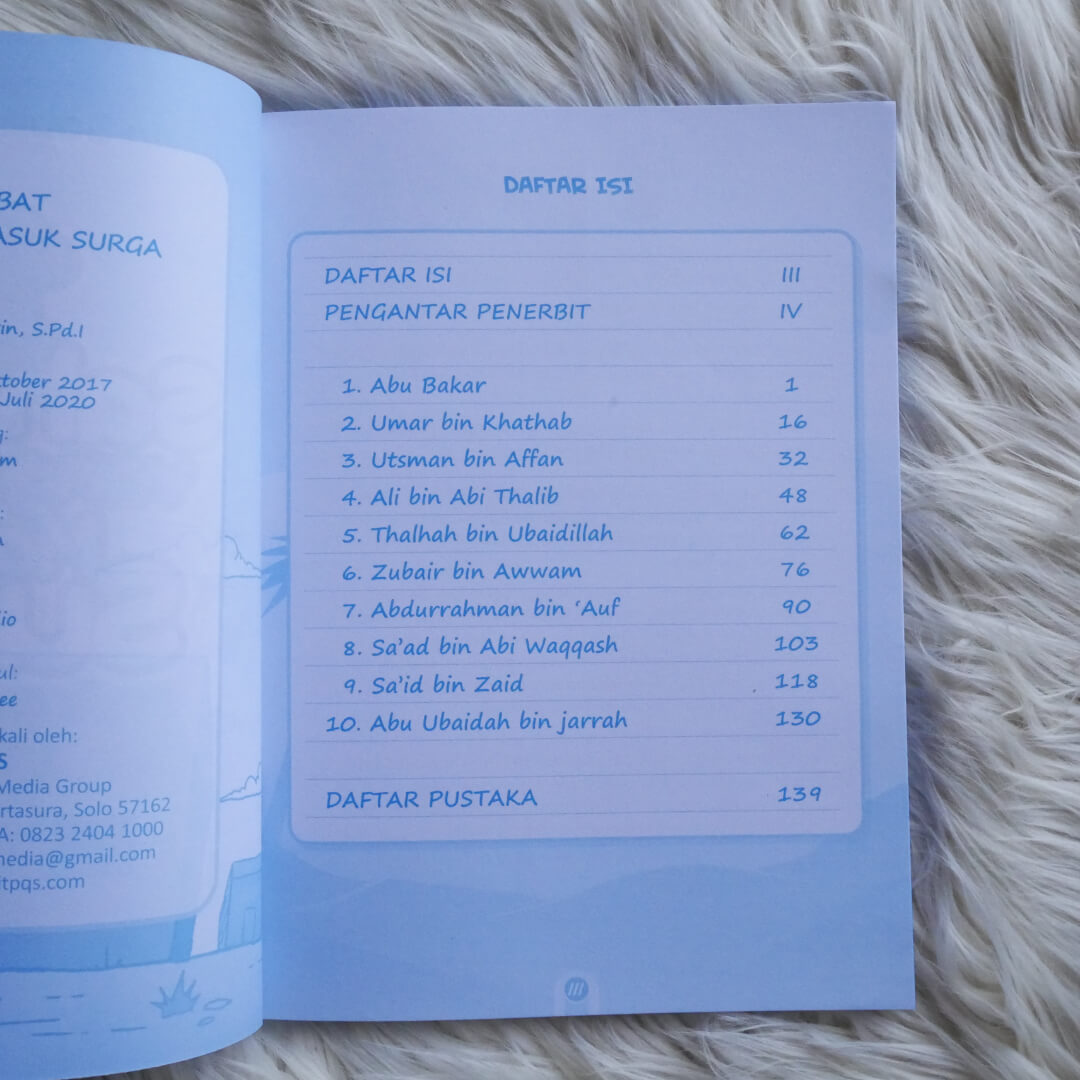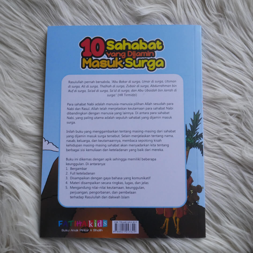 Para sahabat Nabi adalah manusia-manusia pilihan Allah sesudah para Nabi dan Rasul. Allah telah menjelaskan keutamaan para sahabat Nabi dibandingkan dengan manusia yang lainnya. Di antara para sahabat Nabi, yang paling utama adalah sepuluh sahabat yang dijamin masuk surga. Inilah buku yang menggambarkan tentang masing-masing dari sahabat yang dijamin masuk surga tersebut. Selain menjelaskan tentang nama, nasab, keluarga, dan keutamaannya, membaca sepotong kisah kehidupan masing-masing sahabat akan menyadarkan kita tentang berbagai sisi kemuliaan dan keteladanan yang baik dari mereka.