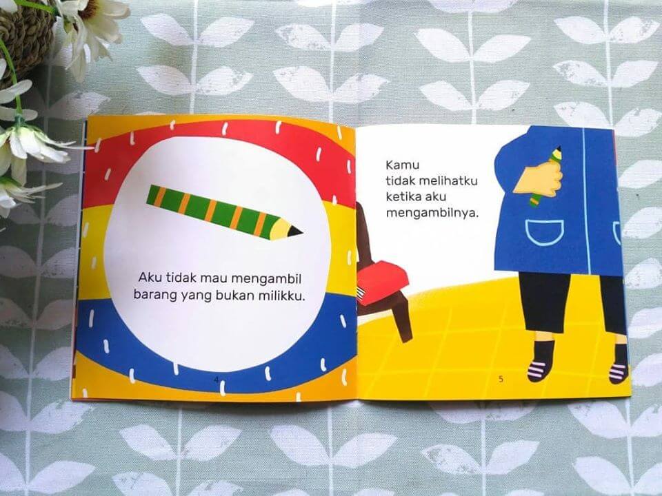 Buku ini mengajarkan sifat ihsan dan muroqobbah (merasa diawasi Allah) untuk anak2, mungkin hanya benda kecil n sepele seperti pensil, tapi jika itu bukan milik kita tidak boleh kita memilikinya, Allah tahu segala yang kita lakukan.