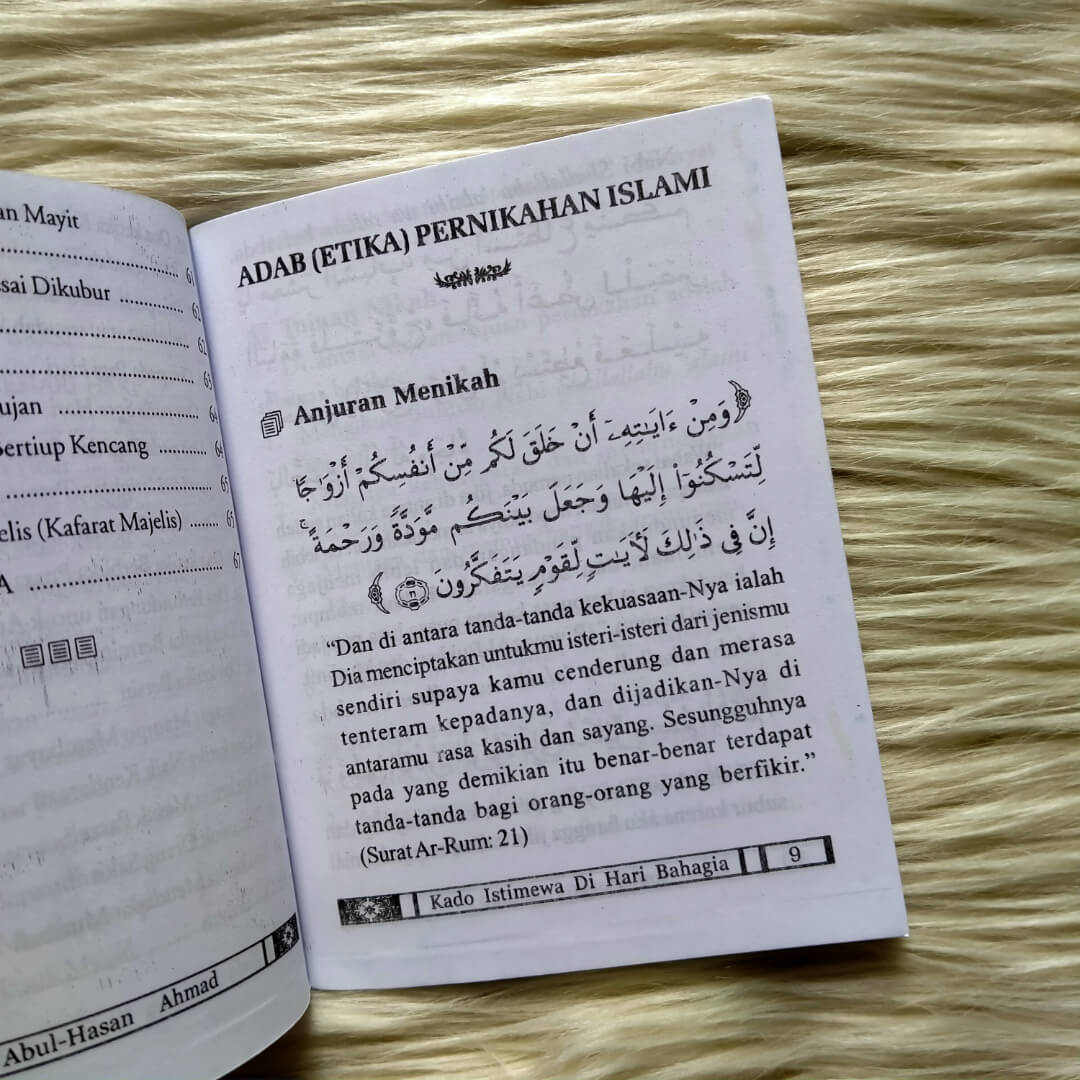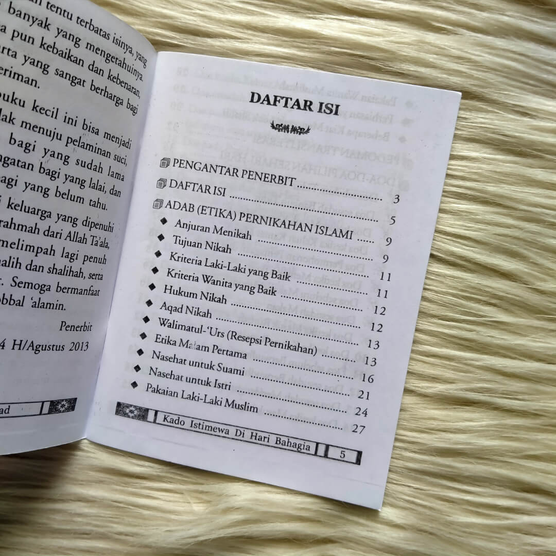 Buku Saku Kado Istimewa Di Hari Bahagia ini menjelaskan bagaimana menyambut pernikahan sesuai sunnah nabi shalallahu ‘alaihi wasallam. Tentunya buku ini sangat bermanfaat terutama untuk pasangan suami istri, baik yang baru saja menikah ataupun yang sudah lama membina rumah tangga.