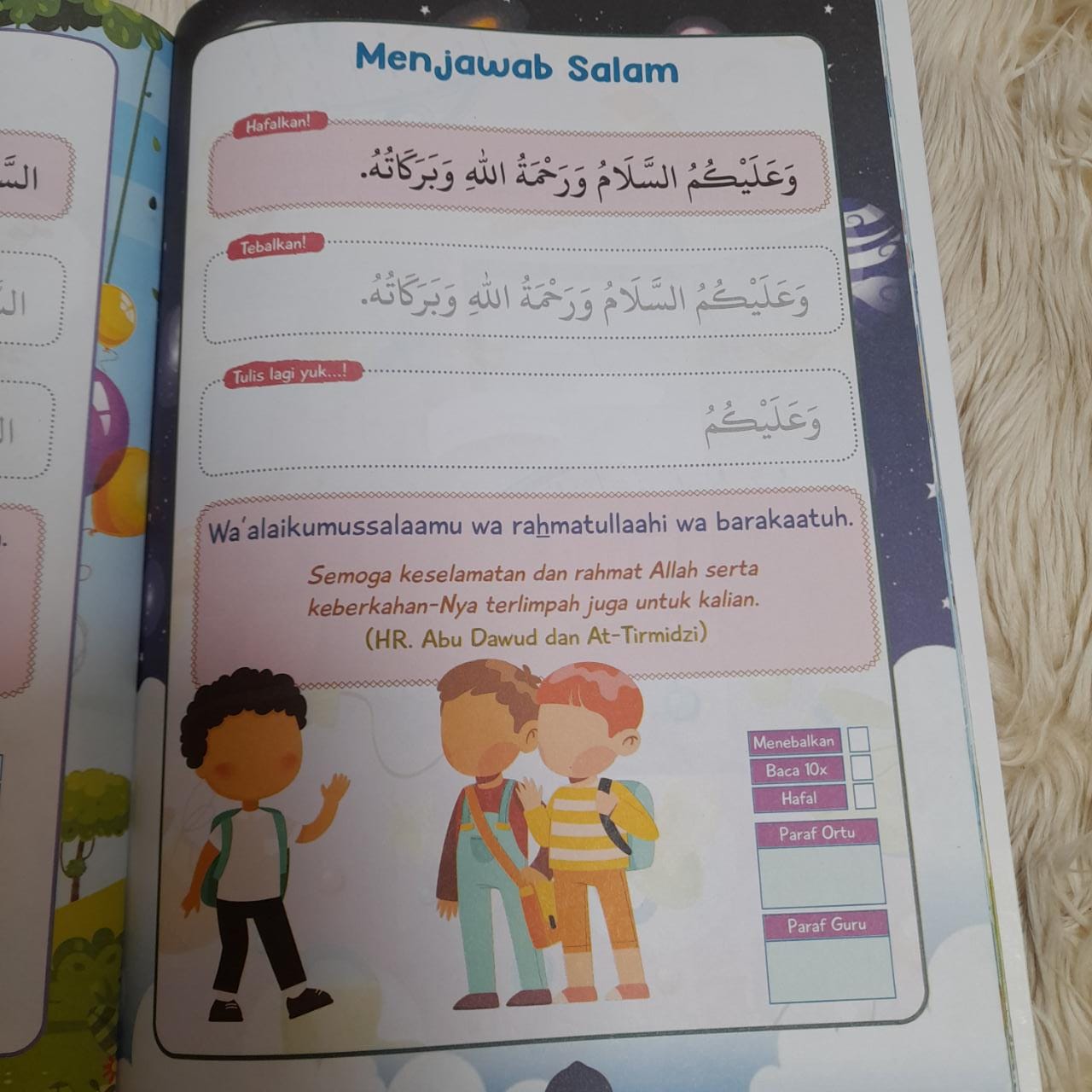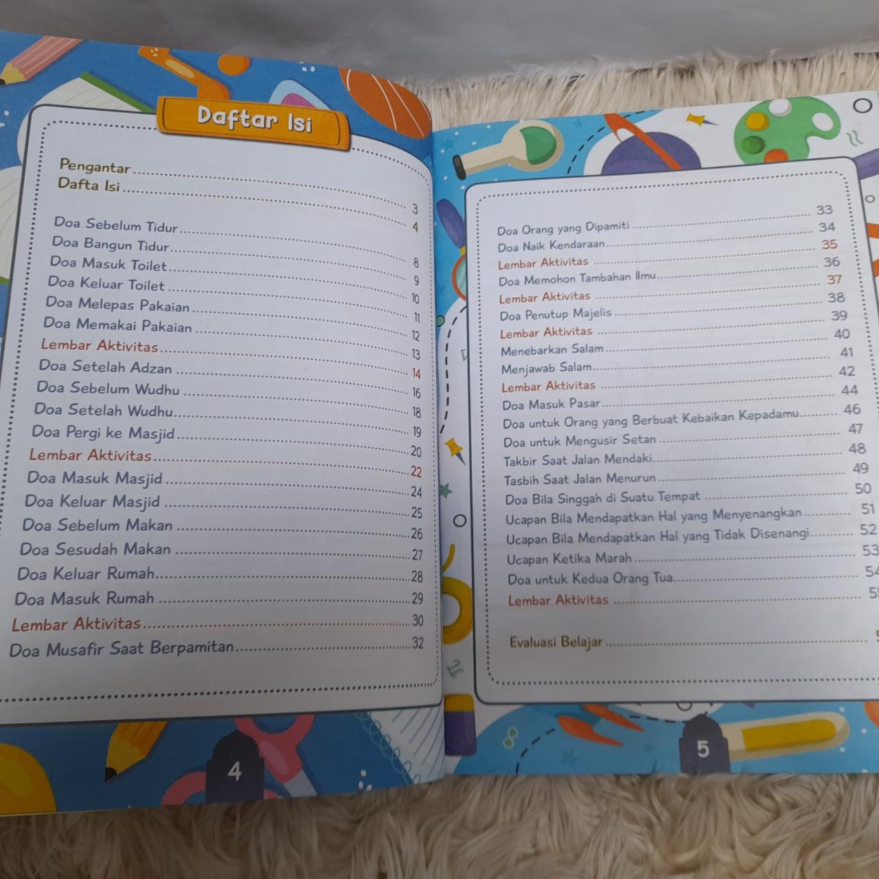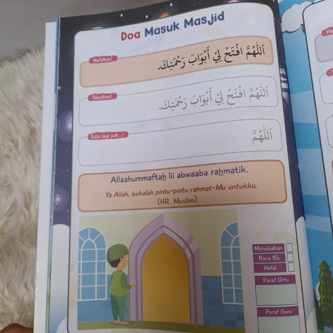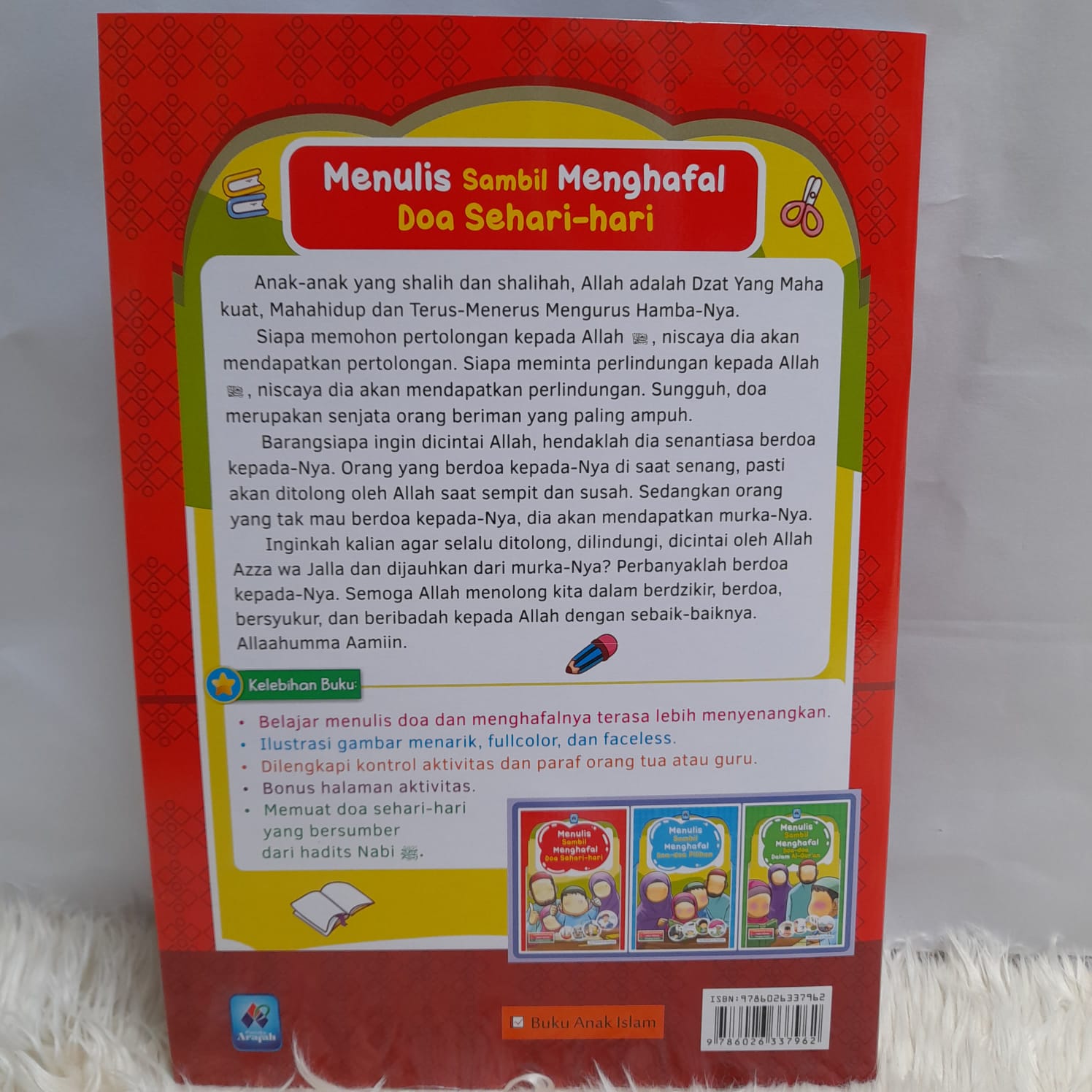 Selain itu, buku ini juga dilengkapi dengan lembar latihan menulis doa yang dapat digunakan oleh anak-anak untuk mempraktikkan hafalan doa mereka.