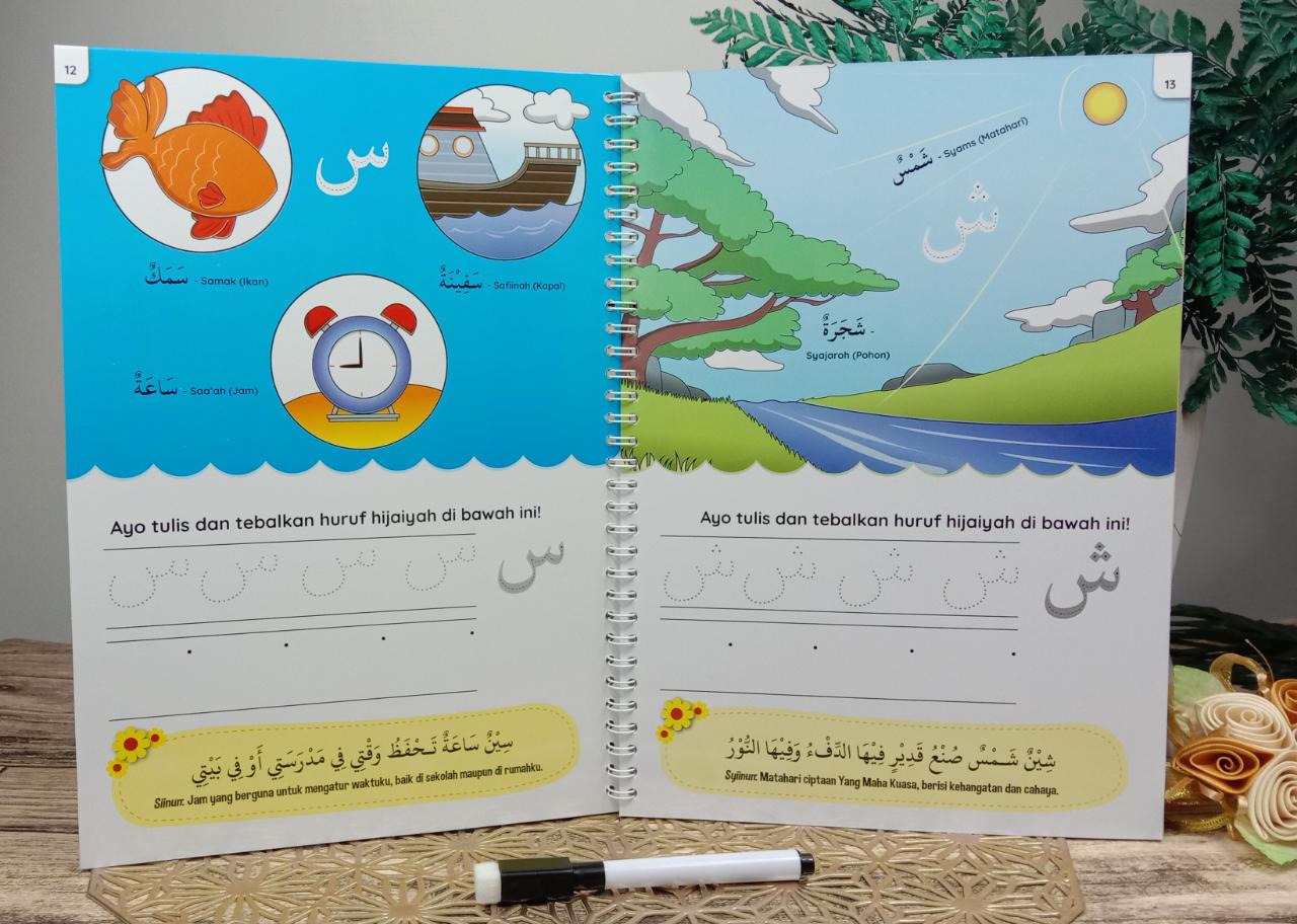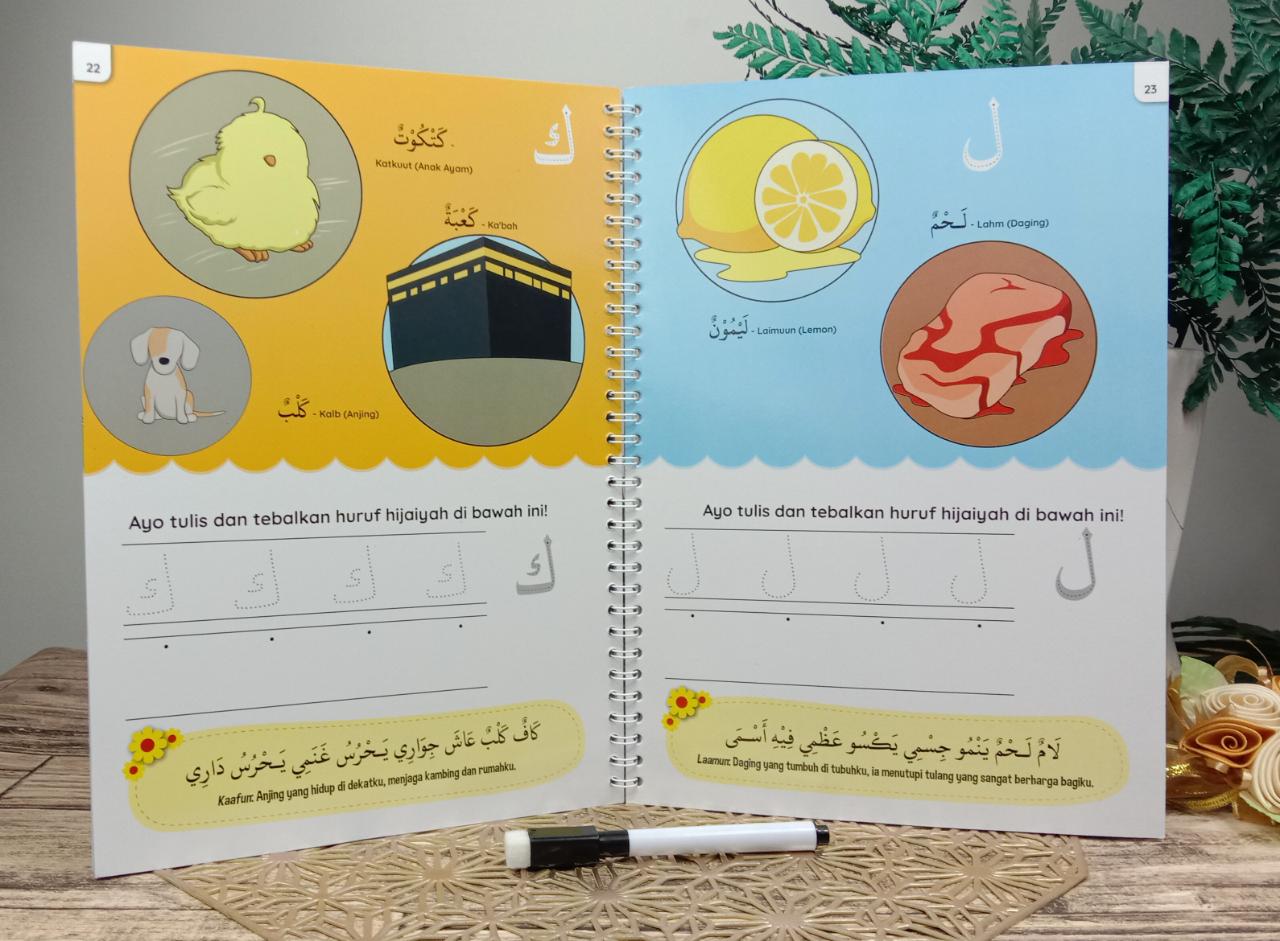 Tapi Buku Huruf Hijaiyah Ahlan memiliki keunikan. Apa itu uniknya? Selain belajar huruf hijaiyah, dan menuliskannya. Buku ini disusun dari nasyid alifun ba' yg terkenal.