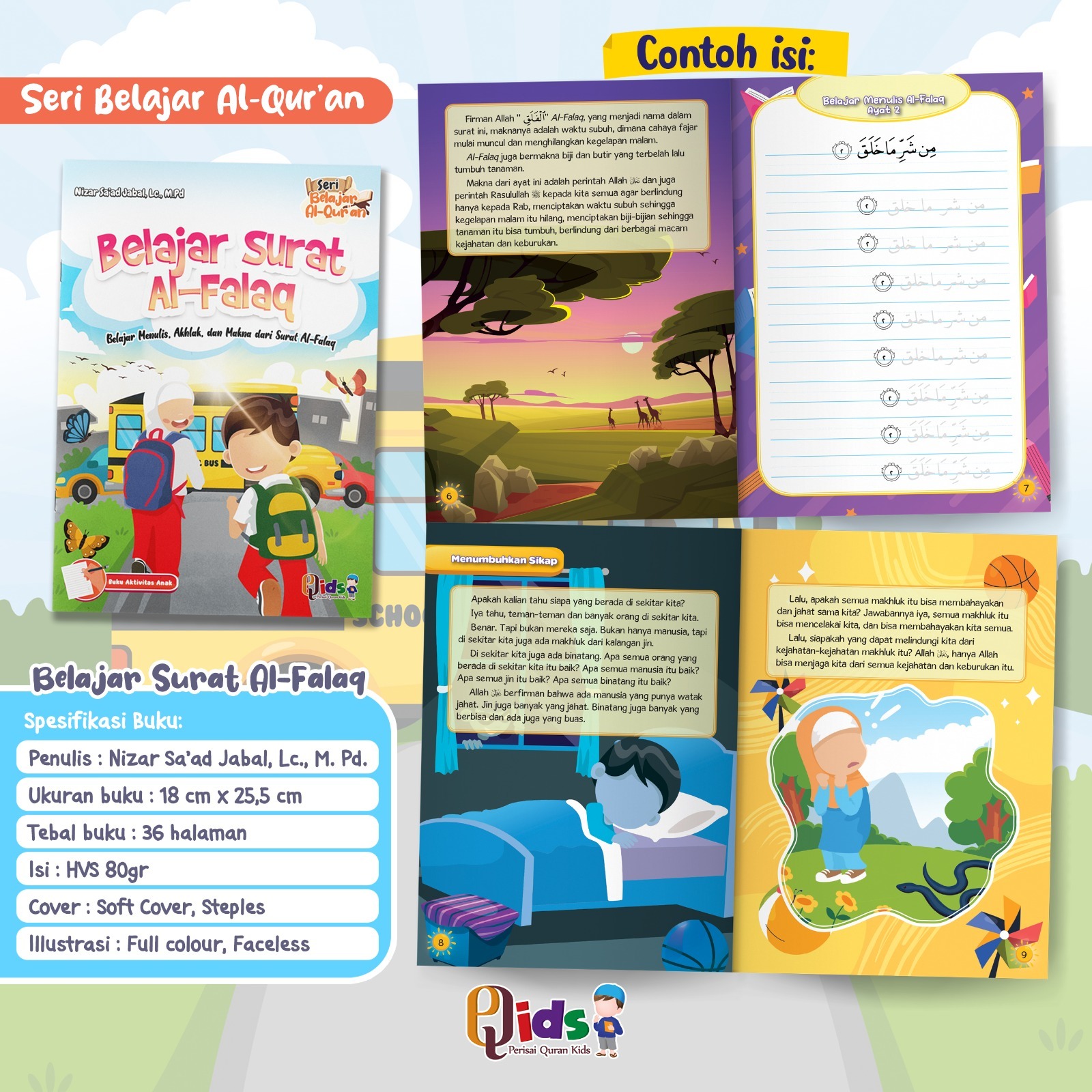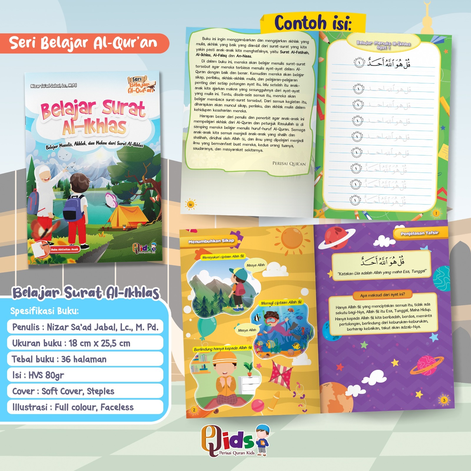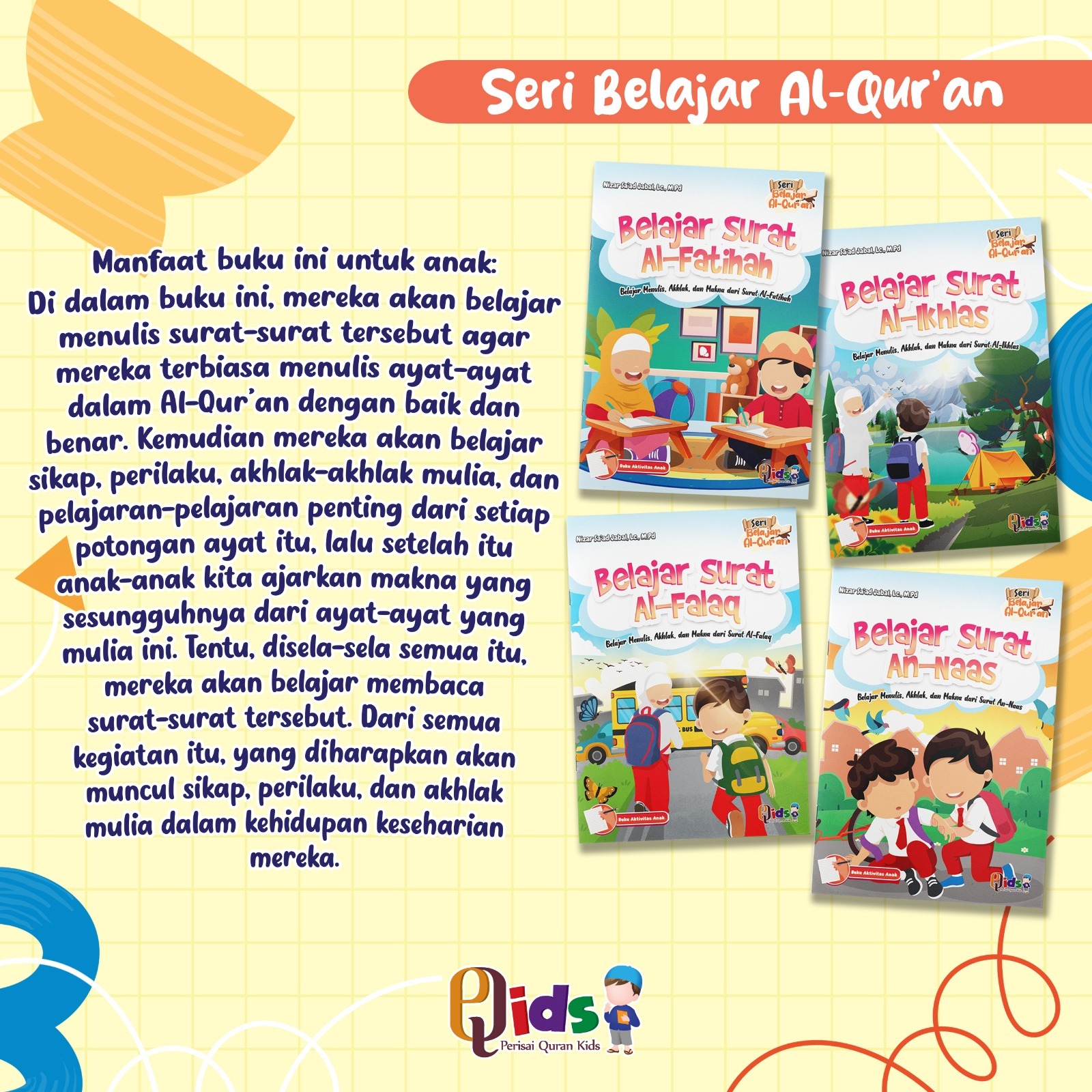 Alhamdulillah telah hadir buku dari Perisai Qur'an Kids dengan judul "Seri Belajar Al-Qur'an" yang terdiri dari 4 jilid. Ayah & Bunda, Buku ini menggambarkan dan mengajarkan akhlak mulia, akhlak yang baik yang diambil dari surat-surat yang kita yakin pasti anak-anak kita menghafalnya, yaitu Surat Al-Fatihah, Al-Ikhlas, Al-Falaq, An-Naas. Didalam buku ini, mereka akan belajar menulis, sikap, perilaku, akhlak-akhlak mulia, dan pelajaran-pelajaran penting dari setiap potongan ayat itu, lalu setelah itu anak-anak kita ajarkan makna yang sesungguhnya dari ayat-ayat mulia ini.