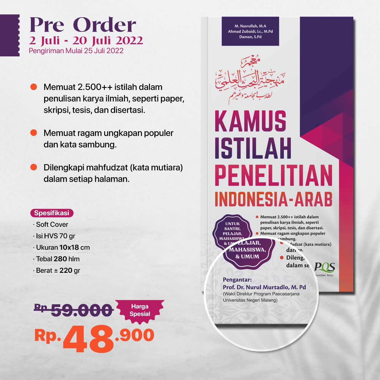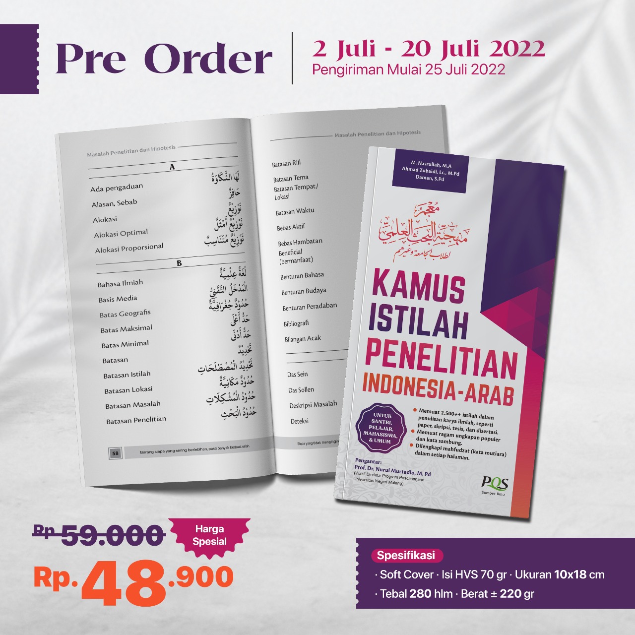Untuk membantu para santri, pelajar, mahasiswa, atau masyarakat umum dalam menemukan istilah-istilah Arab dalam penelitian. Kini telah hadir “KAMUS ISTILAH PENELITIAN INDONESIA-ARAB” Kamus ini menyajikan kosakata secara tematik berdasarkan topik-topik yang memiliki makna sebidang, jadi tidak perlu mencari akar kata dari istilah tersebut, cukup melihat tema dari jenis metodologi yang dimaksud.