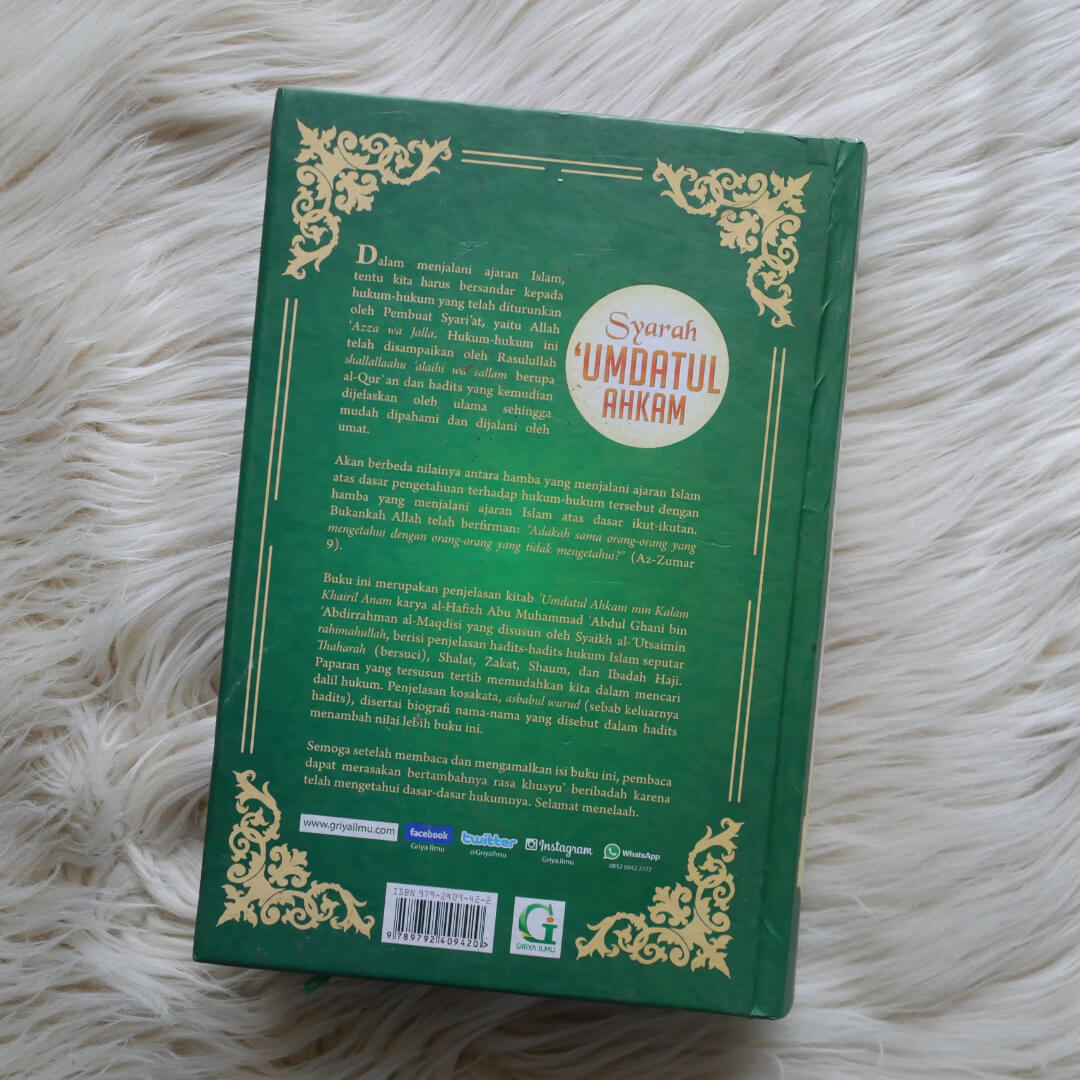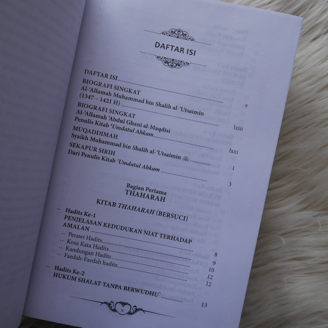 Buku ini merupakan penjelasan kitab ‘Umdatul Ahkam min Kalam Khairil Anam karja al-Hafizh Abu Muhammad ‘Abdul Ghani bin ‘Abdirrahman al-Maqdisi yang disusun oleh Syaikh al-‘Utsaimin rahimahullah, berisi penjelasan hadits-hadits hukum Islam seputar Thaharah (bersuci), Shalat, Zakat, Shaum, dan Ibadah Haji. Paparan yang tersusun tertib memudahkan kita dalam mencari dalil hukum. Penjelasan kosakata, asbabul wurud (sebab keluarnya hadits), disertai biografi nama-nama yang disebut dalam hadits menambah nilai lebih buku ini.