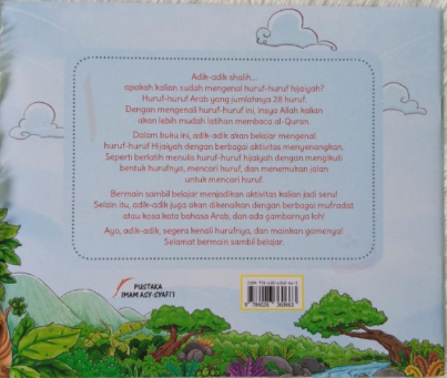 Huruf – huruf Arab yang jumlahnya 28 huruf . Dengan mengenali huruf – huruf ini , insya Allah kalian akan lebih mudah latihan membaca al-Quran . Dalam buku ini, adik – adik akan belajar mengenal huruf-huruf hijaiyah dengan berbagai aktivitas yang menyenangkan. Seperti berlatih menulis huruf hijaiyah dengan mengikuti bentuk hurufnya, mencari huruf, dan menemukan jalan untuk mencari huruf.