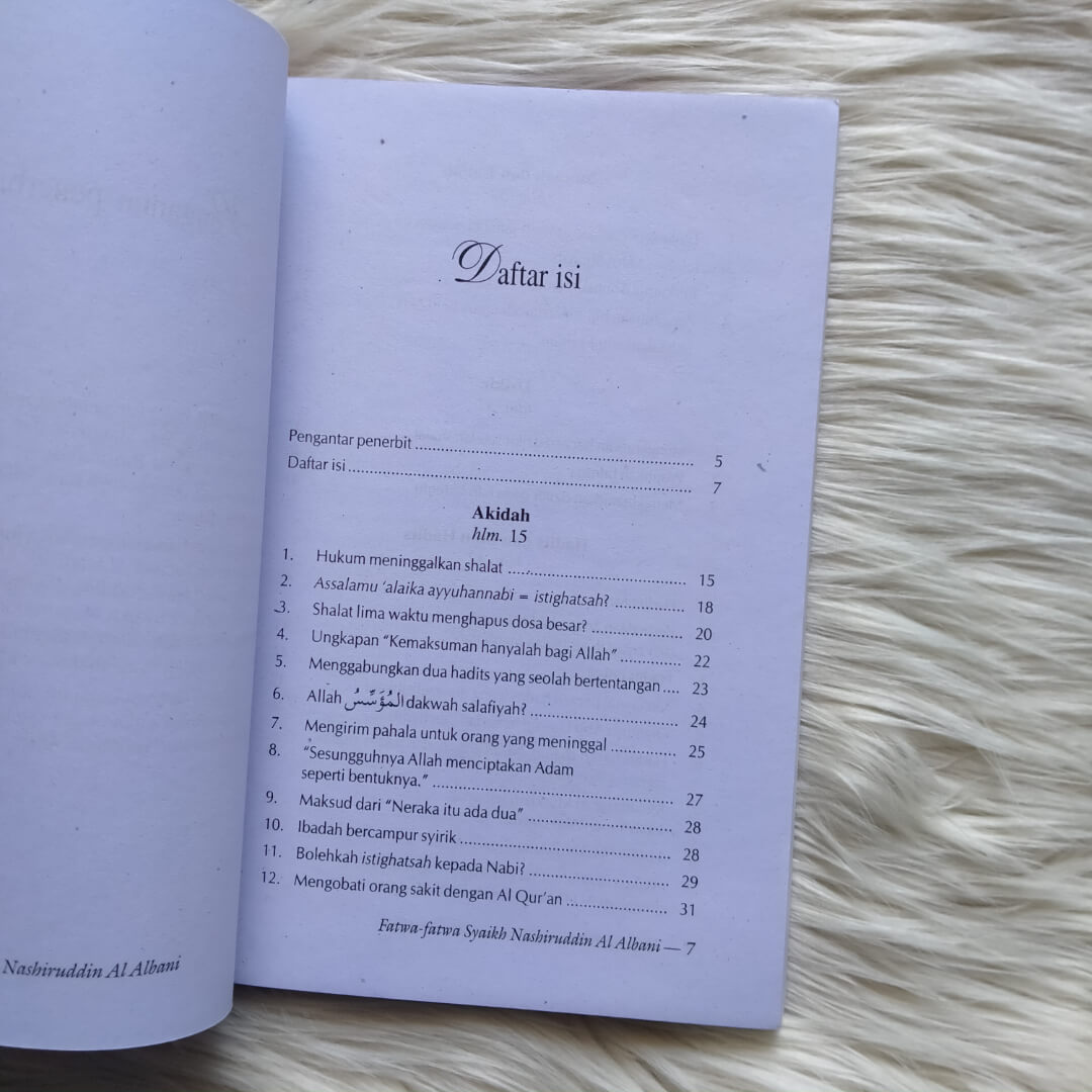 "Buku Fatwa-Fatwa Syaikh Nashiruddin Al-Albani ini adalah terjemahan dari kitab beliau Majmu’ah Fatawa Al Madinah Al Munawwarah. Buku ini menguraikan fatwa-fatwa Syaikh Nashiruddin al-Albani seputar permasalahan aqidah, sunnah dan bid’ah, hadits dan ilmu hadits, ibadah, wanita, dan masalah-masalah umum yang masih membingungkan kaum muslimin. Ditulis secara ringkas dan padat serta ilmiah berdasarkan dalil-dalil syari’at. Buku yang sangat penting untuk rujukan dalam memahami fatwa ulama kontemporer tentang permasalahan yang sedang dihadapi kaum muslimin.
