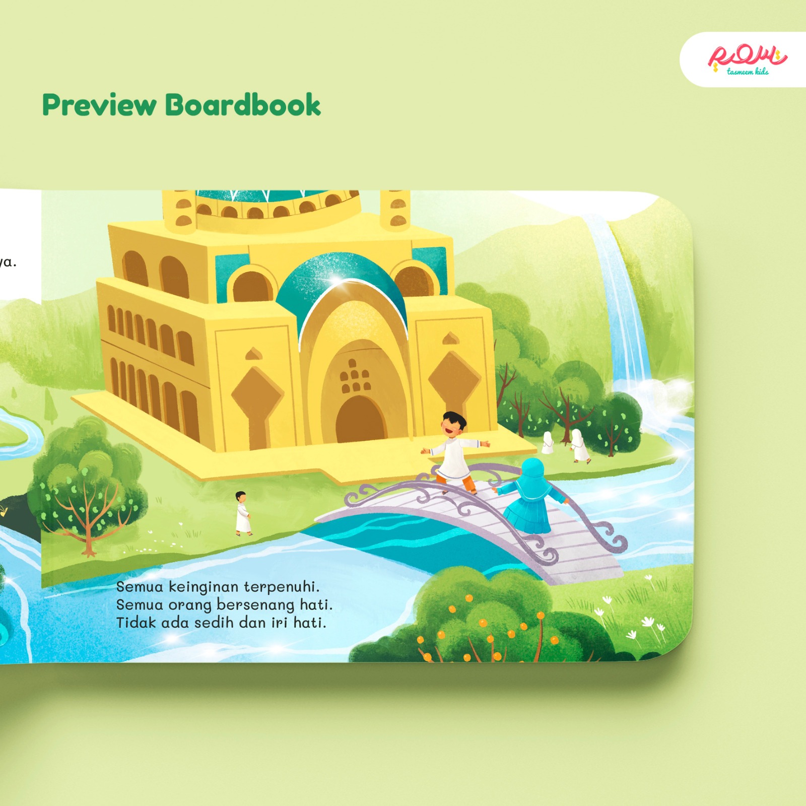 Boardbook terbaru tasmeem, “Kunci Masuk Surga Allah Yang Indah” in syaa allah menjadi media untuk memotivasi si kecil agar mempunyai keinginan besar untuk masuk surga. Karena, Boardbook ini si kecil diajak untuk mengenal indahnya Surga. Dengan mengenal Surga, si kecil akan tahu bahwa pintu surga tidak dapat dimasuki kecuali dengan kuncinya, maka ia akan berusaha mendapatkannya kunci itu.