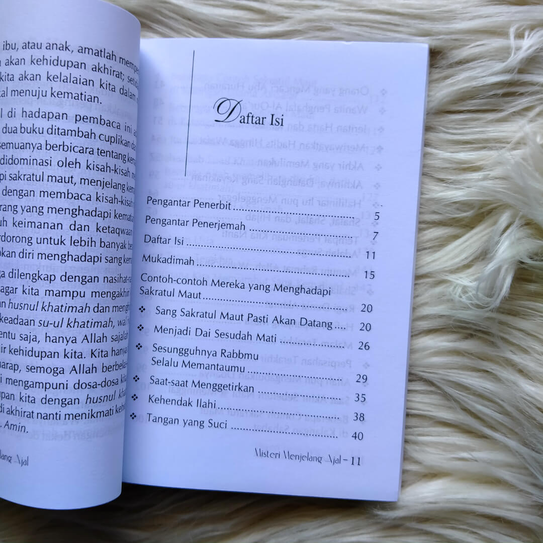 "Buku Misteri Menjelang Ajal yang ada di hadapan pembaca ini adalah terjemahan dari dua buah kitab yaitu kitab Al-Lahazhat Al-Hasimah karya Muhammad bin Abdul Aziz Al-Musnid dan kitab Az-Zairul Akhir karya Khalid Abu Shalih serta cuplikan dari kitab Masyahidul Ihtidhar karya Khalid Abdurrahman Asy-Syayi, dan Sulthan bin Fahd Ar-Rasyid.