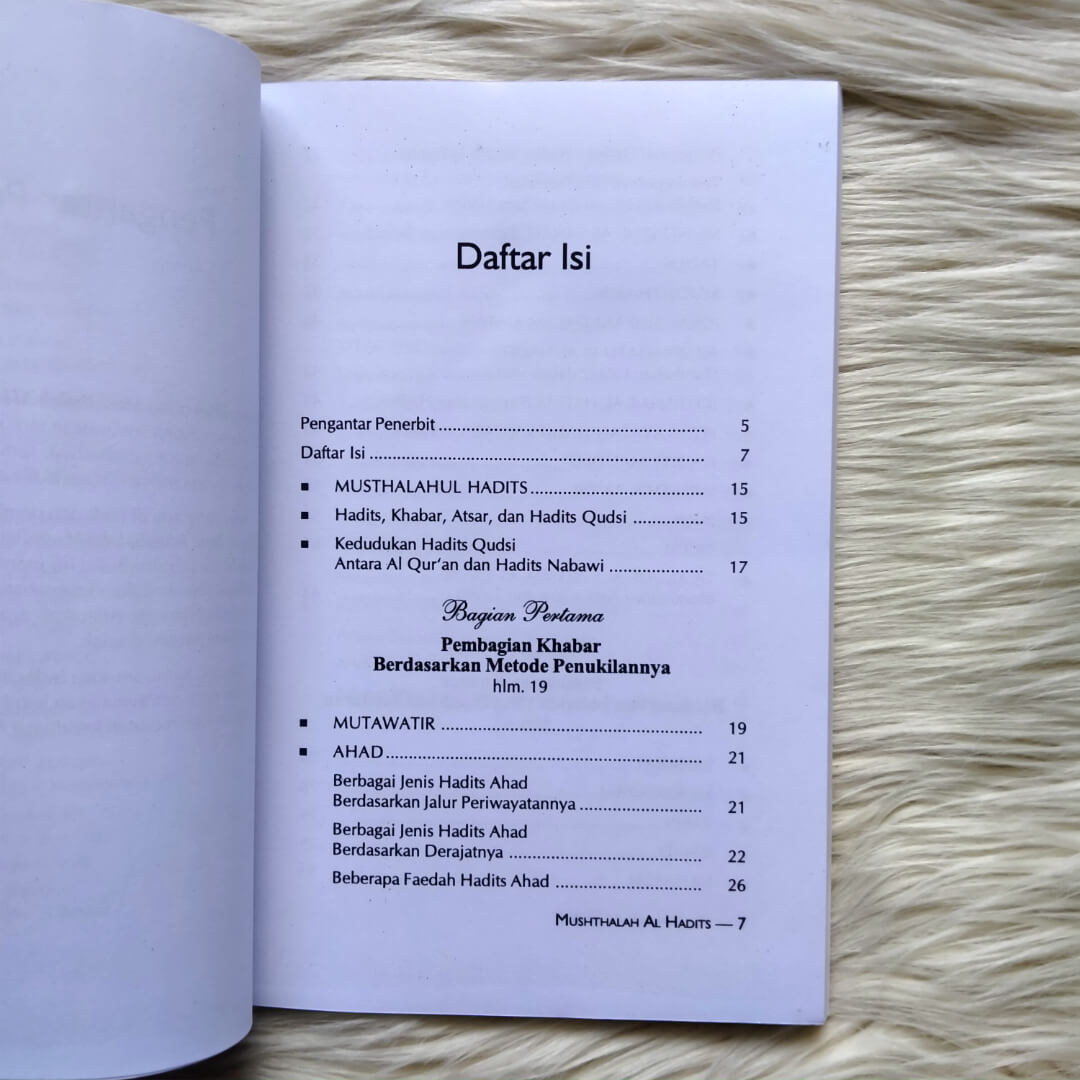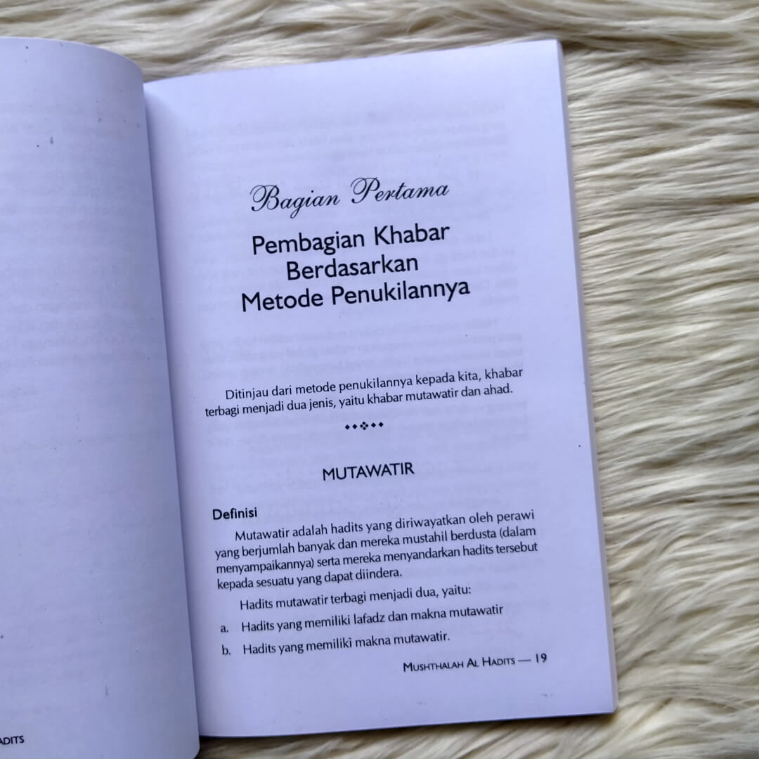 "Buku Mushthalah Hadits di hadapan Anda ini menyajikan pembahasan lengkap seputar ilmu musthalah hadits yaitu ilmu yang mempelajari bagaimana menilai suatu hadits, apakah hadits tersebut shahih diriwayatkan dari Rasulullah shallalahu ‘alaihi wa sallam ataukah tidak. Ilmu ini sangat penting dikuasai oleh thalabul ‘ilmi untuk memilah-milah hadits yang akan dipelajari ataupun untuk memberikan bantahan terhadap pendapat yang menyimpang yang berlandaskan hadits dhaif atau hadits palsu.