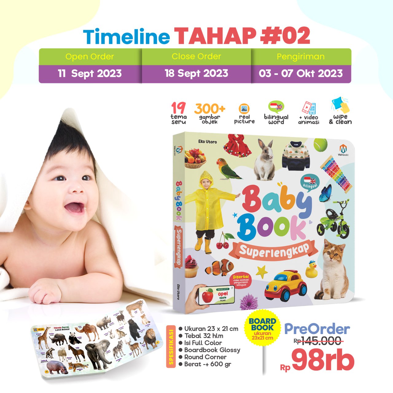 Baby Book Superlengkap dari Visi Mandiri merupakan buku edukasi untuk anak usia dini, khususnya balita, yang dikemas dalam format boardbook yang kokoh dan tahan lama. Buku ini menyajikan lebih dari 300 jenis benda yang dikategorikan dalam 19 tema,mulai dari huruf alfabet, angka, makanan dan minuman, sayur dan buah, bentuk dan warna, anggota keluarga, transportasi, profesi, hewan darat, pakaian, benda di kamar tidur