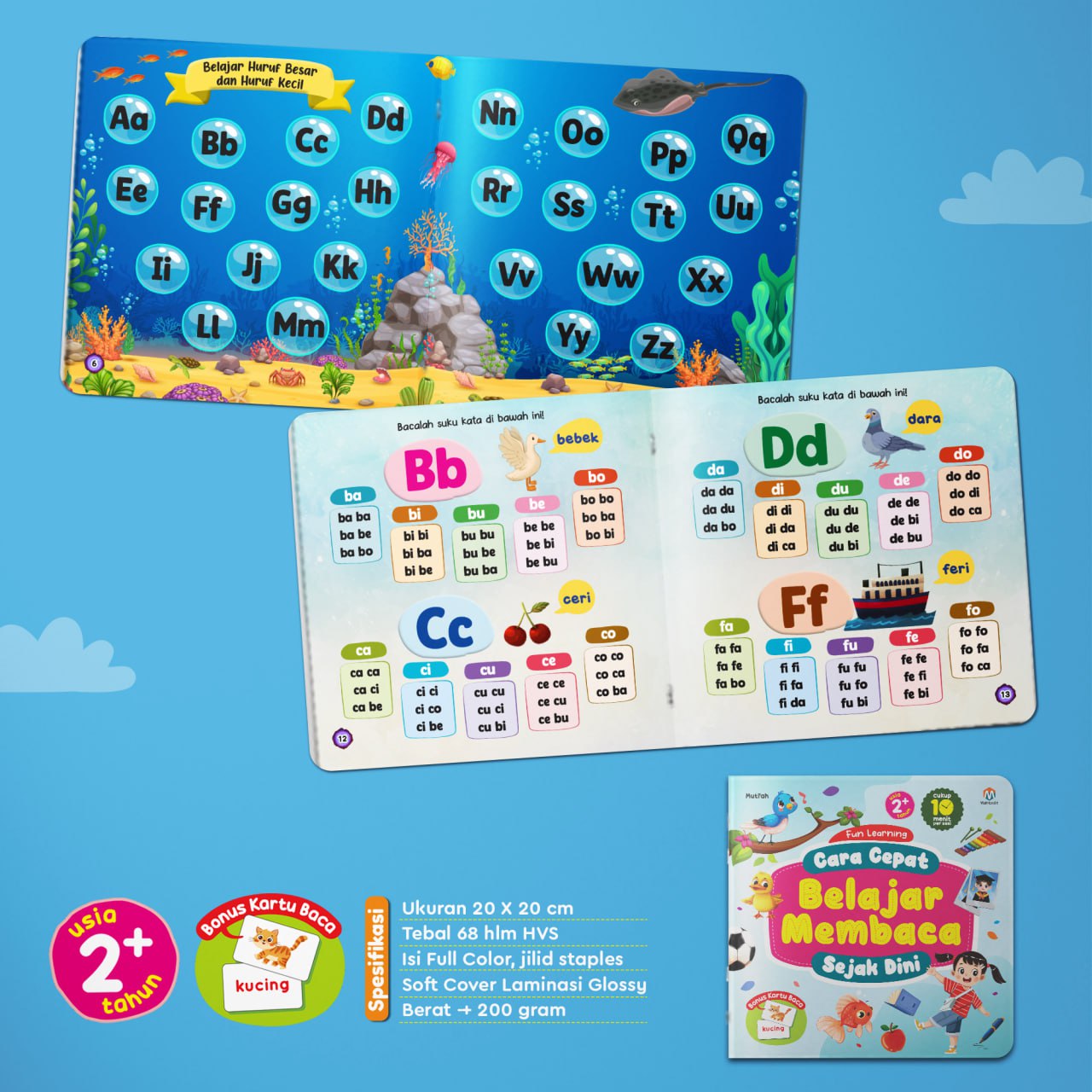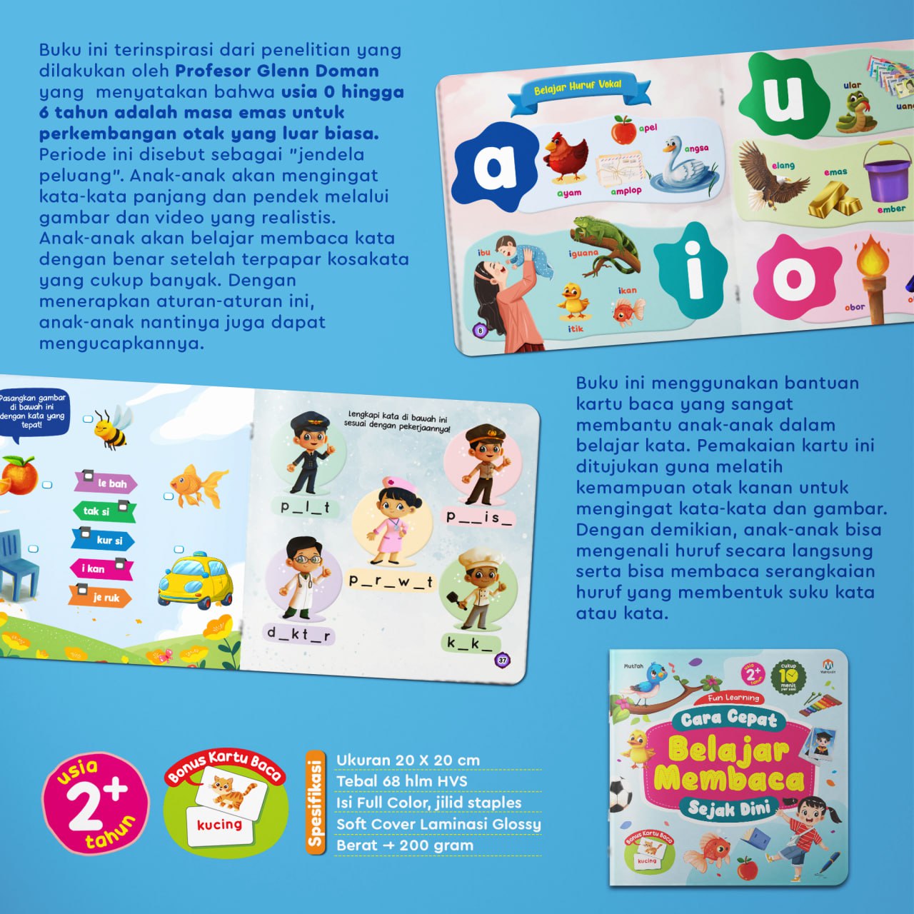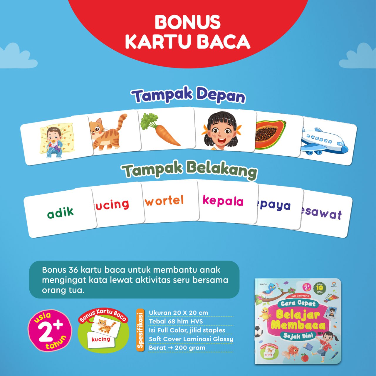 Buku belajar membaca ini dilengkapi dengan 1 set kartu baca bergambar tentang benda-benda yang ada di sekitar si kecil. Hal ini dapat membantu si kecil belajar membaca lebih cepat
