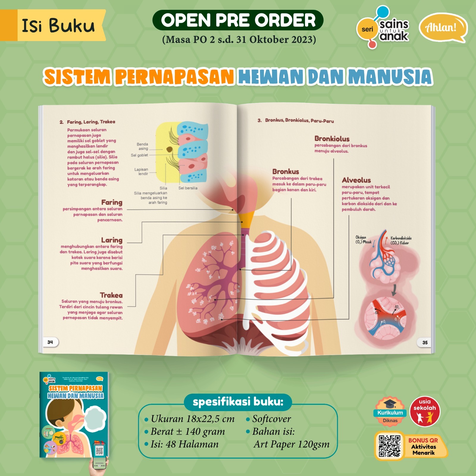 Nah, buku ini menjelaskan sistem pernapasan dengan cara yang mudah dipahami. Buku ini dilengkapi dengan ilustrasi proses dan organ pernapasan baik pada manusia maupun hewan. Buku ini menguraikan 4 tipe pernapasan. Apa saja ya? Buku ini juga dilengkapi dengan percobaan untuk memperagakan cara kerja proses pernapasan.