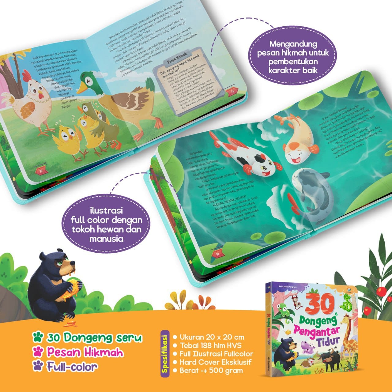 Buku yang full color dan penuh ilustrasi ini memuat 30 kisah seru yang diperankan oleh manusia dan hewan sebagai karakter utamanya. Tentu saja di setiap kisahnya terkandung nilai moral untuk membentuk akhlak terpuji si kecil????