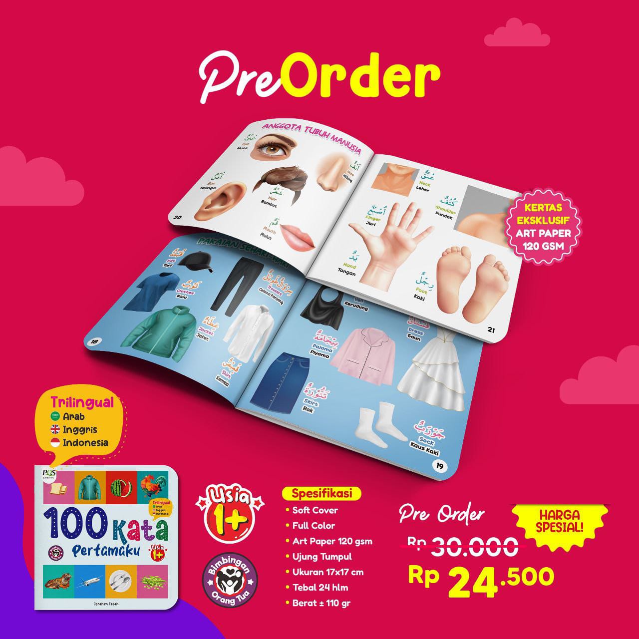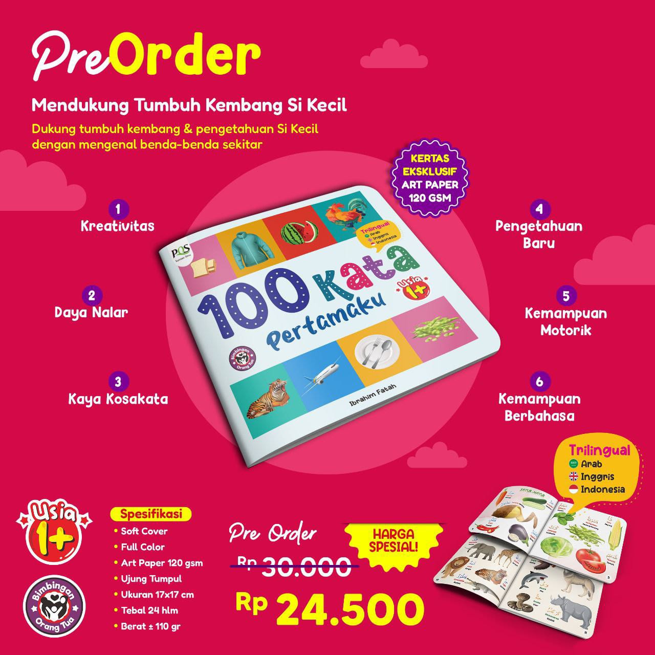 Buku “100 Kata Pertamaku” merupakan media belajar yang asyik dan bermanfaat untuk meningkatkan kosakata, kemampuan bahasa, stimulasi penglihatan dan memberikan informasi baru untuk Si Kecil.