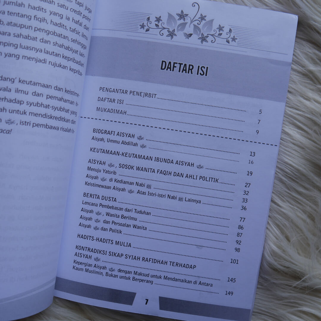 Buku ini memaparkan segudang keutamaan dan keistimewaan Aisyah, luasnya cakrawala ilmu dan pemahaman Islamnya dan bantahan-bantahan terhadap syubhat-syubhat yang dilontarkan kaum orientalis dan Syiah untuk menghina dan menodai kehormatan pribadi Aisyah radhiyallahu anha. Kisah-kisah dalam buku ini akan menjadi inspirasi besar dan motivasi berlipat bagi kaum muslimah agar menjadi hamba kesayangan Allah dan RasulNya. Selamat membaca buku yang bermanfaat ini..